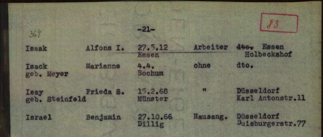 Im Sommer 1942 erfasste die Gestapoleitstelle Düsseldorf die älteren jüdischen Menschen in ihrem Bezirk, um auch ihre Deportation in die Wege zu leiten. Am 21. Juli 1942 wurde Frieda Isay vom Güterbahnhof Düsseldorf-Derendorf in das Ghetto Theresienstadt deportiert. Sie verstarb im Ghetto am 9. Dezember 1943 im Alter von 75 Jahren.