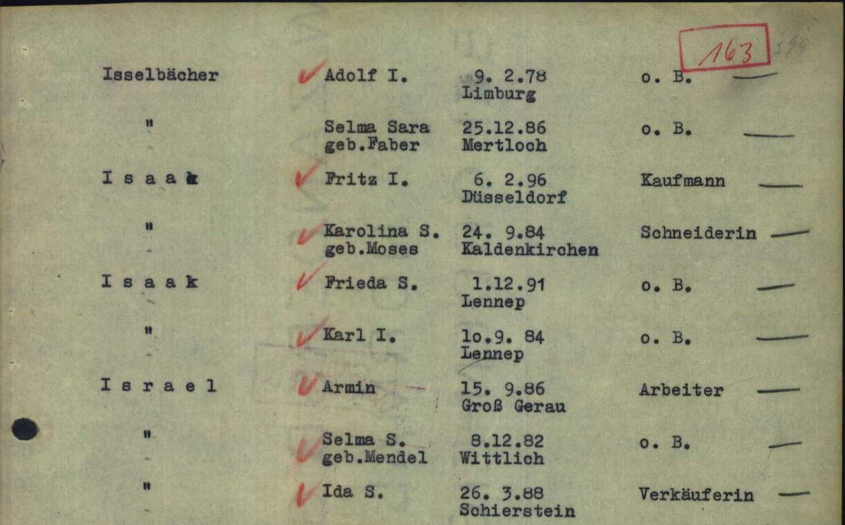 Bereits im August 1941 wurden rund 5.000 russische Jüdinnen und Juden im Ghetto von Minsk von deutschen Einheiten ermordet. Am 6. und 7. November 1941 fand die erste große sogenannte „Aktion“ im Ghetto statt. Angehörige der SS, der Einsatzgruppe A sowie der Sicherheitspolizei und des SD erschossen in der Nähe des Ortes Tutschinka etwa 12.000 Jüdinnen und Juden. Die leerstehenden Häuser im Ghetto wurden anschließend mit aus Deutschland deportierten Jüdinnen und Juden belegt. Zu diesen Deportierten gehörten auch Armin Israel seine Frau Selma und Ferdinand Wyngaard. Sie gehörten zu den 627 Düsseldorfer Jüdinnen und Juden, die am 10. November 1941 zusammen mit weiteren 366 Personen aus anderen Städten in einem Transport nach Minsk deportiert wurden. Insgesamt zählte der Transport 993 Menschen.