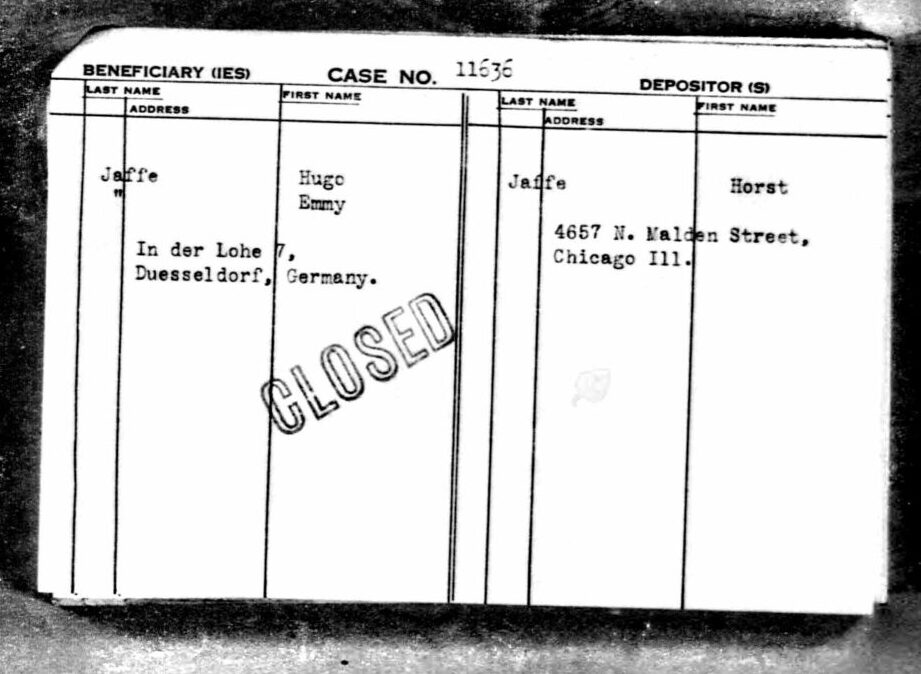 Im Jahr 1940 wurde Hugo Jaffe zur Zwangsarbeit in Düsseldorf verpflichtet, sein Arbeitsbuch hatte die Nummer 169/280033. Er verletzte sich bei Unfällen am 26. November 1940 und am 22. April 1941 und war bis zum 18. Dezember 1940 bzw. bis zum 14. Juni 1941 arbeitsunfähig. Am 1. August 1941 musste das Ehepaar Jaffe zwangsweise in eine Ein-Zimmer-Wohnung im Parterre der Harleßstraße 8 umziehen. Dieses Haus hatte den jüdischen Familien Sass und Gumpert gehört und wurde zuletzt zu einem sogenannten „Judenhaus“. Sein Sohn berichtete seine Eltern, dass er am 31. August 1941 in Chicago die vormals deutsche Jüdin Käthe Stein (1914-2015) geheiratet hatte. Hugo Jaffe schrieb am 3. September 1941 an seinen Sohn und dessen Ehefrau Käthe in den USA: „Meine l. Kinder! […] Wir haben uns recht gut eingewöhnt u. sind sehr zufrieden. Wir sind in einer feudalen Wohnung, herrliches Haus, gute Lage u. kommen blendend mit unseren Heimgenossen aus. Die 2 schönen Zimmer, straßenwärts, haben wir. Die hinteren Zimmer haben an der ganzen Hausseite Sonnenterrassen, vor dem schönen Garten. […] Ich habe zumeist im Bett gelegen, […]. Mal kam der Eine, mal der Andere, mir die Zeit vertreiben, auch ins Krankenhaus, wo ich mich bald wieder dünn machte. Die 7. Woche habe Hausarrest, soll immer liegen. Jetzt wird es hoffentlich besser, aber einige Wochen werden noch vergehen, bis wieder arbeiten kann. In den 8 Monaten, daß ich arbeite, habe 4 davon krank gelegen. Das ist in dieser kurzen Zeit mehr, als in den letzten 3 Jahrzehnten zusammen, ausschließlich der Zeit des Weltkrieges. Die ganze Sache ist nicht tragisch zu nehmen, wenn keine Komplikationen dazu kommen, u. ich wieder meinen Beruf ausüben kann. […]“