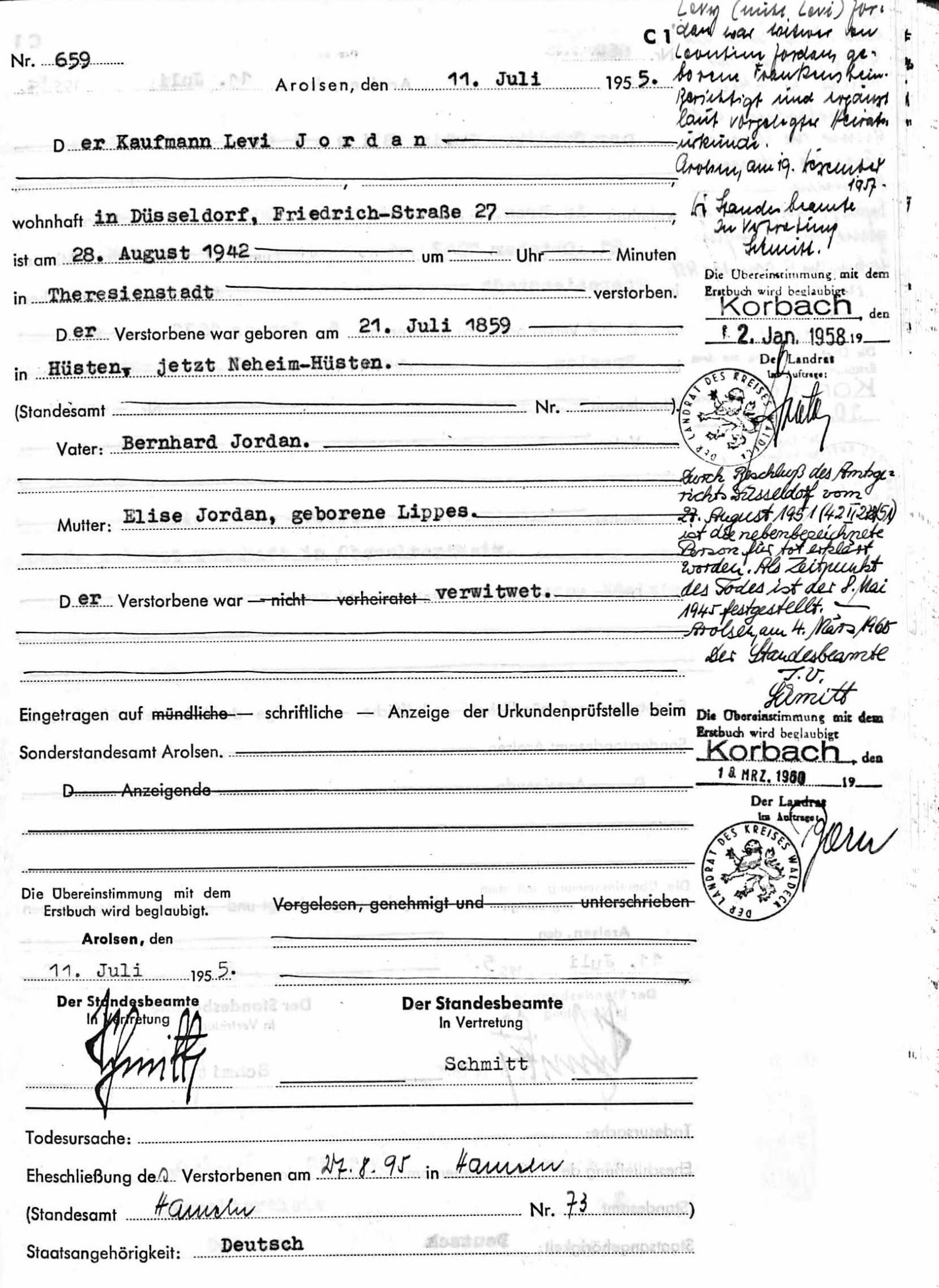 Im Dezember 1941 zog Levi Jordan in die Friedrichstraße 24. Am 21. Juli 1942 wurde Levi Jordan von Düsseldorf aus in das Ghetto Theresienstadt deportiert. Hier verstarb er am 25. August 1942 im Gebäude L415, Zimmer 15 an den Folgen einer Lungenentzündung.