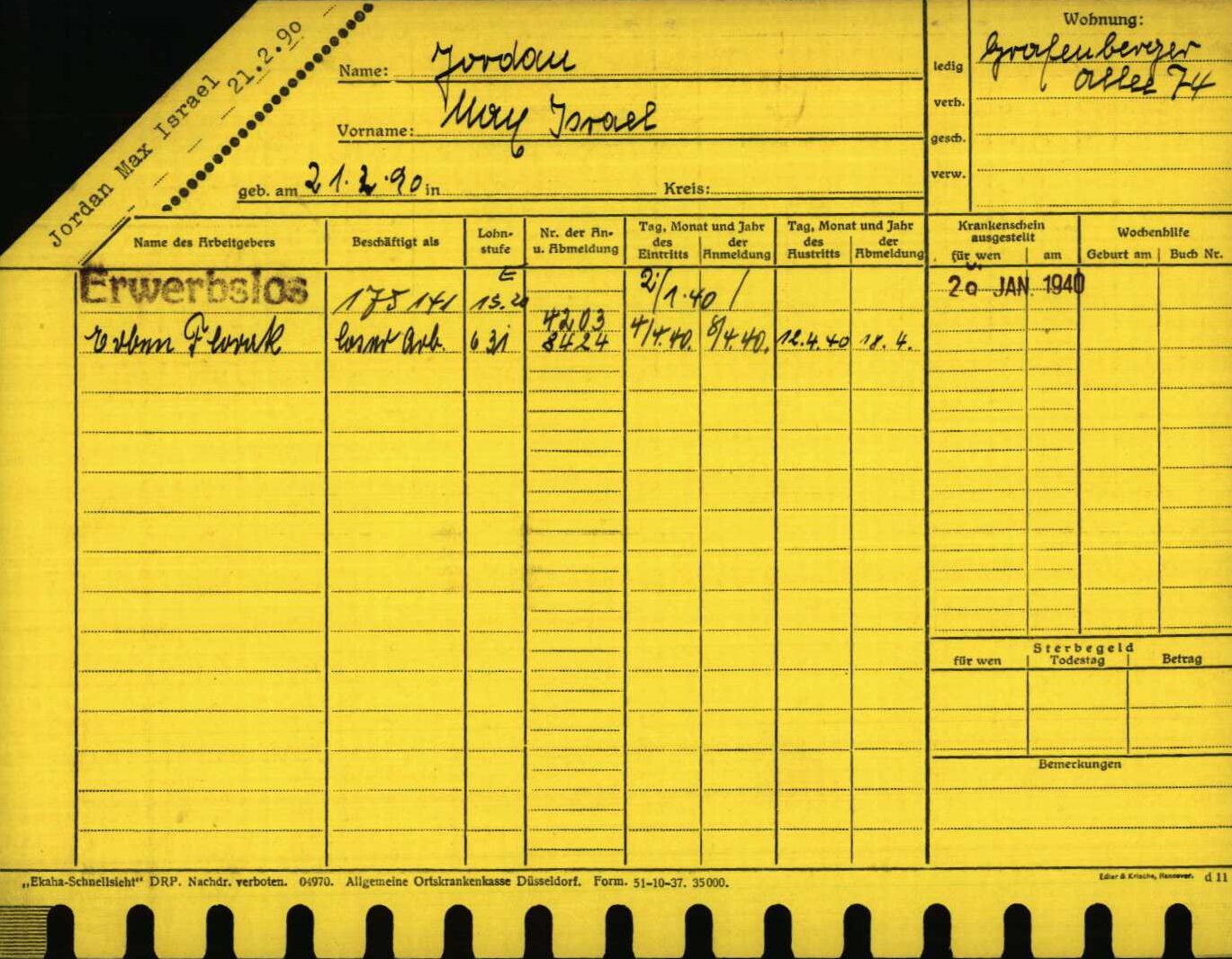 Mit Zunahme der Diskriminierung jüdischer Menschen wurde auch der Alltag der Familie Jordan immer schwieriger. Max Jordan musste seine eigene Firma aufgeben. Er arbeitete später für die Metalldruckerei Eduard Ohligschläger in Düsseldorf.