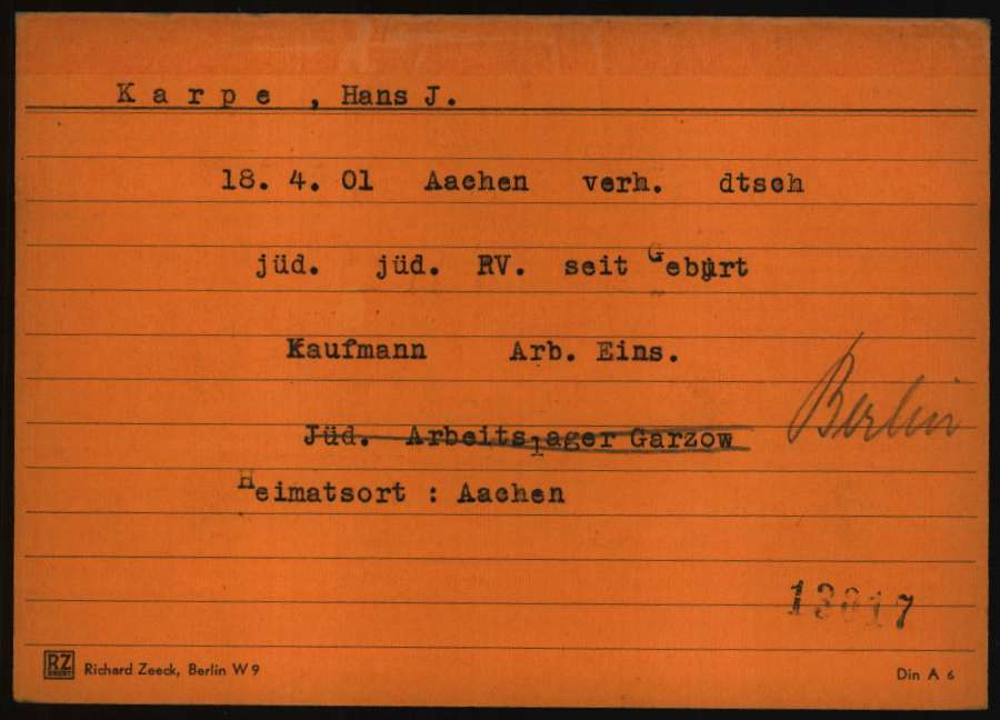Nachdem seine Ehefrau und ihr gemeinsames Kind im September 1942 ermordet worden waren, zog Hans Karpe nochmals innerhalb des Ghettos um, und zwar, wie es auf der Anmeldekarte heißt, „am 4. September 1942 mit 1 Person in die Wohnung 11 an der Fischstr. 12 a“. Im Feld „Frühere Adresse“ wurde „Rückkehr von der Arbeit ausserhalb des Ghettos“ notiert. Am 12./13. November 1942 zog er im Rahmen einer „Transaktion“, wie es auf der Abmeldekarte heißt, in ein Zimmer der Wohnung 47 in der Fischstraße 21. Später arbeitete Hans Karpe im Ghetto in der Abteilung „Kart.[offel] und Gem.[üse] Mieten“ der Personalabteilung. Am 1. Februar 1943 wurde er von der Abteilung als gestrichen gemeldet, denn Hans Karpe hatte am 27. Januar 1943 mit dem 44. Arbeitertransport das Ghetto verlassen. Wo Hans Karpe starb, ist bisher nicht bekannt. Beim ITS in Bad Arolsen wurde auf seiner Karteikarte vermerkt: „7.42 Letzte Nachricht, geflohen“.