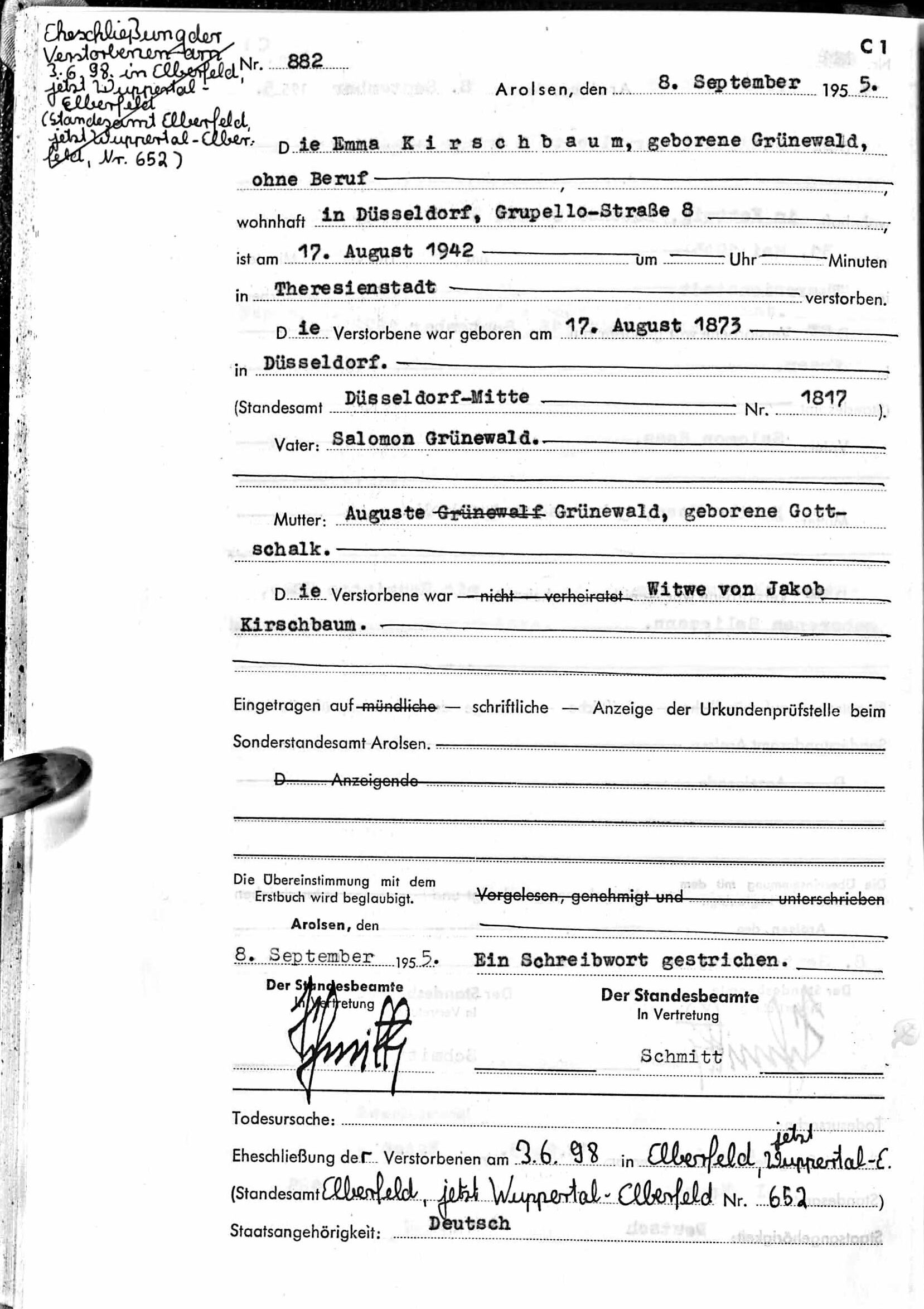 Am 21. Juli 1942 wurden Emma Kirschbaum, ihre Geschwister und ihr Schwager von Düsseldorf aus in das Ghetto Theresienstadt deportiert. Hier verstarb Emma Kirschbaum am 17. August 1942 im Alter von 69 Jahren. Nur kurze Zeit später verstarb auch ihr Bruder Eduard Grünewald am 3. September 1942 an den Folgen einer Lungenentzündung.