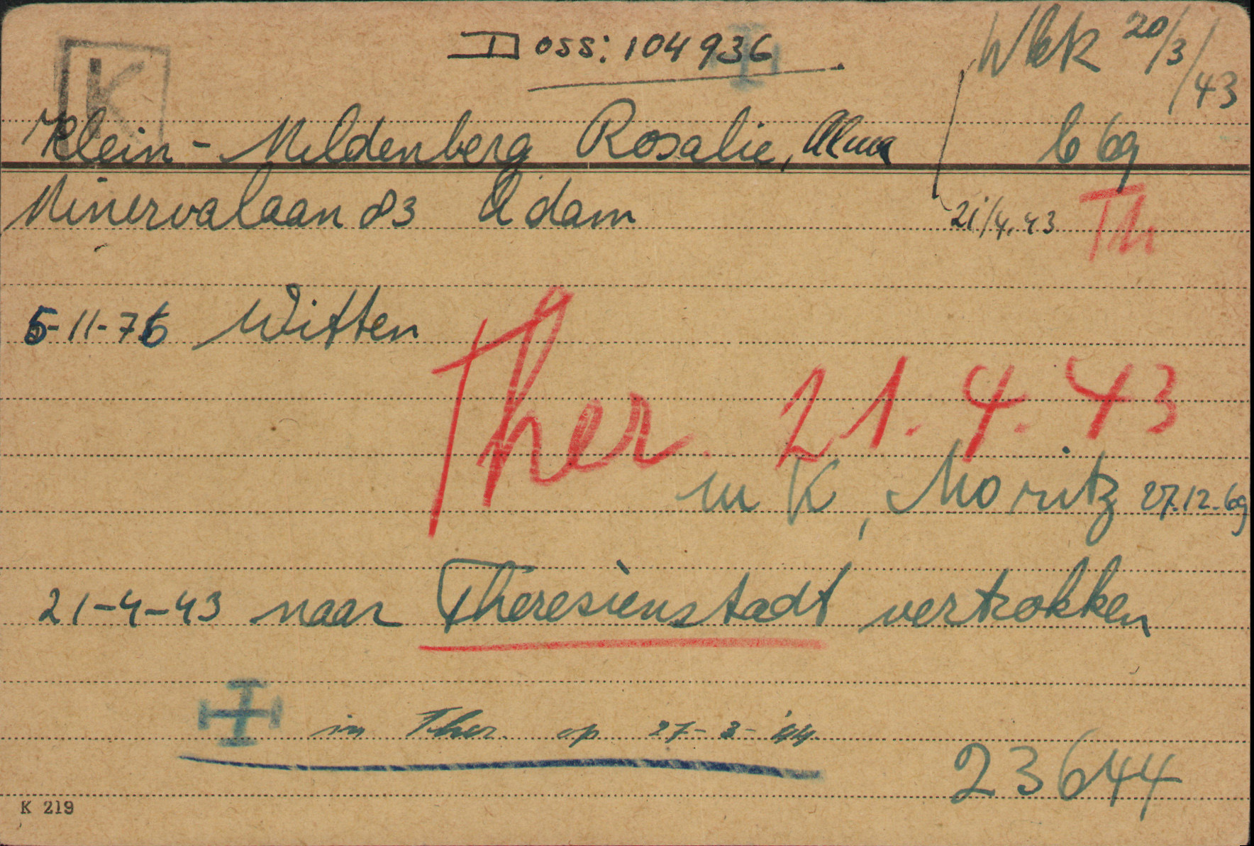 Am 20. März 1943 wurden auch Alma und Moritz Klein in das Judendurchgangslager Westerbork gebracht. Sie wurden dort der Baracke 69 zugeteilt. Am 20. April 1943 wurde sie zusammen mit ihrem Ehemann in das Ghetto Theresienstadt deportiert.