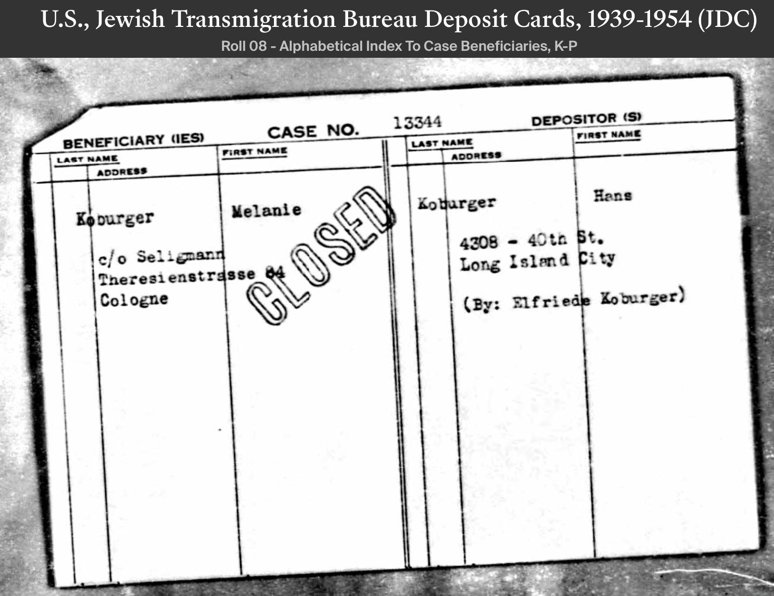 Seit dem 11. März 1941 wohnte Melanie Koburger für eine kurze Zeit in einer Pension in Köln, die ihr ihre Schwester Eugenie Seligmann vermittelt hatte. Melanie Koburger kehrte aber nach einiger Zeit wieder nach Düsseldorf zurück. Als letzte Adresse ist dort seit dem 5. September 1941 die Grupellostraße 8 – ein „Judenhaus“ – belegt.