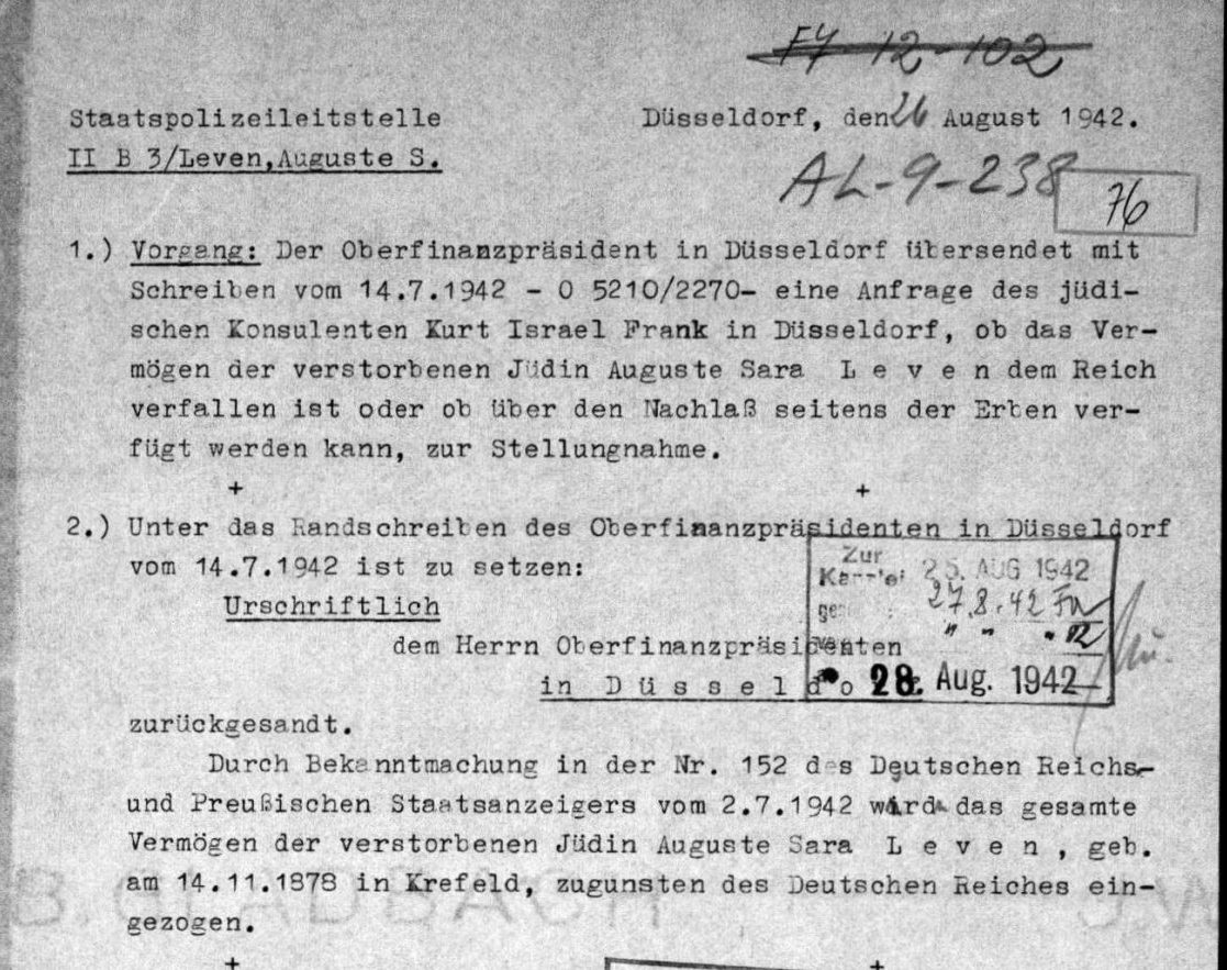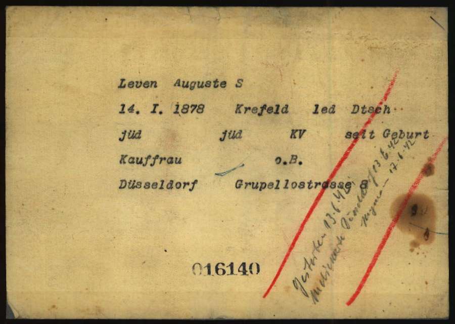 Im Juni 1942 wurde Auguste Leven dazu aufgefordert, sich zur „Evakuierung“ am 15. Juni nach Izbica bereitzuhalten. Sie entzog sich dieser Deportation durch Suizid am 13. Juni 1942.