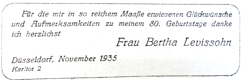 Ihre Schwester Emma Levissohn wohnte gemeinsam mit ihrer Mutter Bertha bis zu deren Tod 1936 in Düsseldorf im Haus Karltor 2. Im Adressbucheintrag des Jahres 1930 ist folgender Eintrag vermerkt: Levissohn, Emma und Berta, Sozialbeamtinnen. 1939 steht unter der gleichen Adresse: Levissohn, Emma, Fürsorgerin. Ab dem 24. September 1939 war ihre Schwester Emma Levissohn (auch) in der Grafenberger Allee 74 gemeldet. Zwei Häuser weiter lag das Gemeindehaus der Synagogengemeinde, wo Emma Levissohn als Wohlfahrtspflegerin arbeitete. Neben der Unterbringung und Versorgung älterer Gemeindemitglieder oblag ihr die Fürsorge der Armen sowie die Beratung in vielen Bereichen des täglichen Lebens.