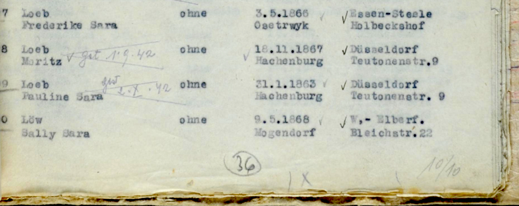 Am 18. Dezember 1941 zog Pauline Löb mit ihrem Bruder in die Teutonenstraße 9 in Düsseldorf. Beide wurden aus Düsseldorf am 21. Juli 1942 in das Ghetto Theresienstadt deportiert. Dort verstarb ihr Bruder Moritz Löb am 1. September 1942. Auf der Todesfallanzeige wurde als Todesursache Schlaganfall eingetragen. Pauline Löb verstarb am 2. Oktober 1942 im Ghetto Theresienstadt.