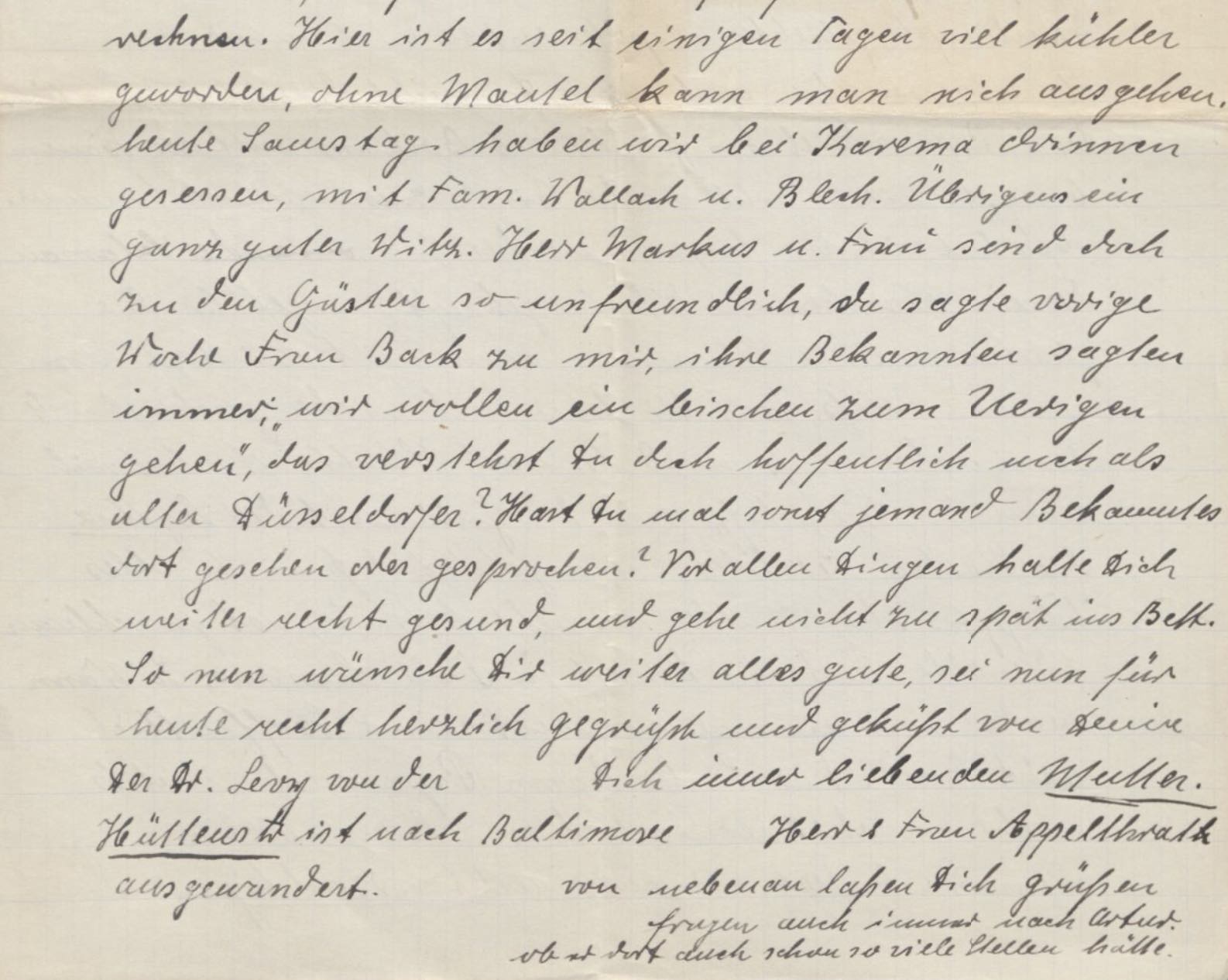 Ihr Sohn Willy emigrierte 1937 nach Amerika. Amalie Malsch und ihr Mann standen danach in regem Briefkontakt mit ihm. So schrieb ihm Amalie Malsch z.B. am 20. Juni 1937 über Emigrationsbemühungen von Freunden und Bekannten: „Frau Kahn muß am 28. d.M.s. nach Stuttgart, hat sich schon bei Meyerhoff zum 28. Juli mit der Lcythia die Karten bestellt, vorausgesetzt dass in St. alles klappt. Ihre Mutter ist sehr betrübt, ist ja schlimm für alte Leute, Du kennst ja Frau Simons. Wann werden wir einmal so weit sein? Hoffentlich recht bald. Für Linke kann Papa auch nichts mehr machen, er hat kein Leder mehr.“ Und über die kleinen Alltagsfreuden: „heute Samstag, haben wir bei Karema drinnen gesessen, mit Fam. Wallach und Blech. Übrigens ein ganz guter Witz. Herr Marcus und Frau sind doch zu den Gästen so unfreundlich, da sagte vorige Woche Frau Back zu mir, ihre Bekannten sagten immer „wir wollen ein bisschen zum Uerigen gehen“, das verstehst du doch hoffentlich noch als alter Düsseldorfer?? (…) “