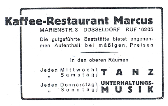 1956, anlässlich eines Düsseldorf Besuches, berichtete Hedwig Marcus über die Ereignisse der Pogromnacht 1938: “Gegen Mitternacht saß ich… mit meinem verstorbenen Mann Paul Marcus im Büro des „KAREMA“ (Kaffee-Restaurant-Marcus) Marienstraße 3 zu Düsseldorf, nachdem er etwa 10 Minuten zuvor einen Brief in den Briefkasten gebracht hatte. Die Straße war leer und totenstill gewesen. Plötzlich kam unser Buffetier, Leo Abraham, hereingestürzt, um zu melden, dass Nazibanden ins Kaffee eingedrungen waren und schon flogen auch Steine durchs Fenster. Wir suchten Schutz hinter Möbelstücken, während auch Uniformierte ins Büro eindrangen. Mein Mann öffnete eine sonst stets verschlossene Türe zum Hausflur, um auf der Polizeiwache Meldung zu machen und Hilfe zu holen, die übrigens achselzuckend verweigert wurde.