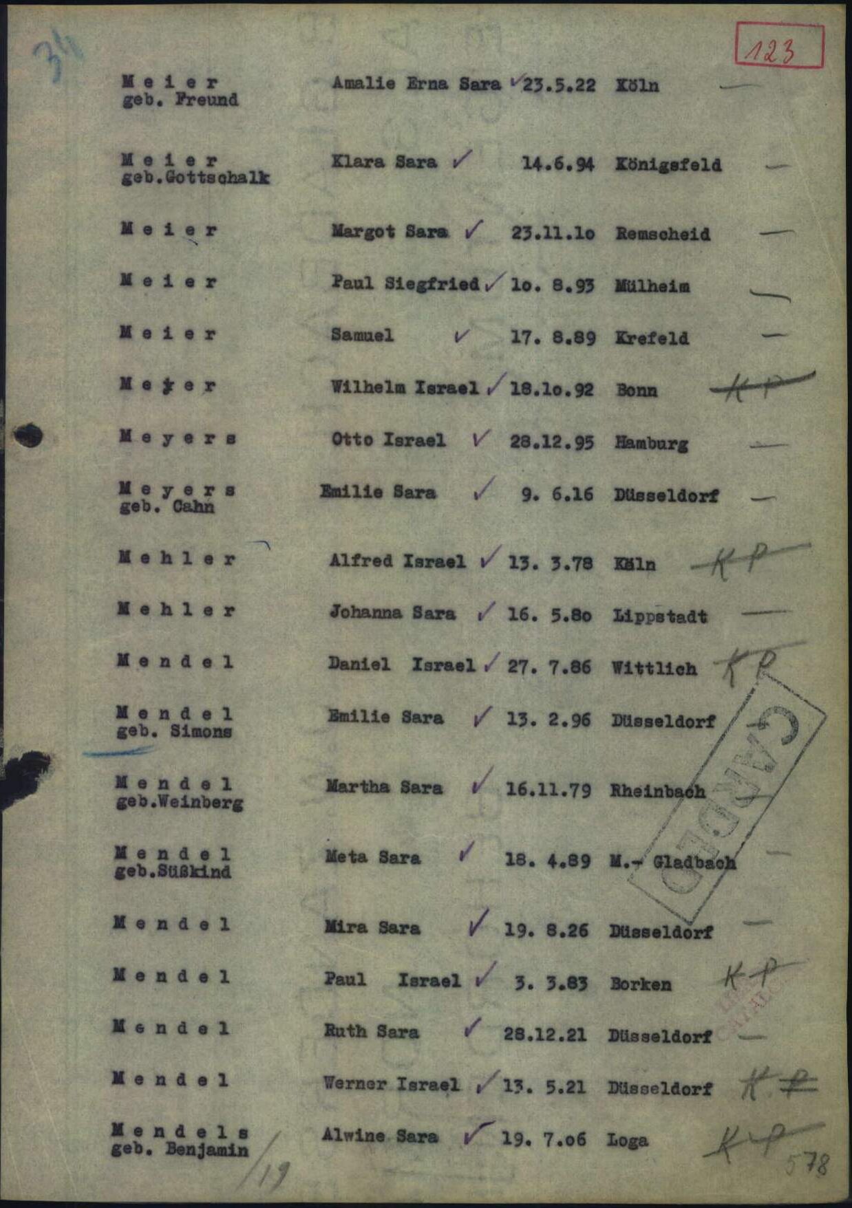 Archiwum Panstwowe w Lodzi, APŁ: GV, Sign. 29208, ohne Paginierung; PSZ, Sign. 997, L 19621, Bl. 579, Transportlisten Altreichsjuden (u.a. Düsseldorf: Transportliste 13 Düsseldorf); PSZ, Sign. 1188, L 19805, Bl. 56, Abt. Einsiedlungswesen – Listen Lebensmittel, Quittungen für zurückgegebene Arbeitsausweise, Namenslisten; PSZ, Sign. 1222, L 19839, Bl. 113, Verschiedenes, u.a. Totenliste Altreichsjuden (Fragment), Hauslisten Fischstraße 15 und 21 (u.a. Brot- und Lebensmittellisten, Kollektiv Düsseldorf, Fischstraße); PSZ, Sign. 1236, L 19853, Bl. 35, Transportlisten; PSZ, Sign. 1387, L 20004, Evidenzbuch der Kartenabteilung;