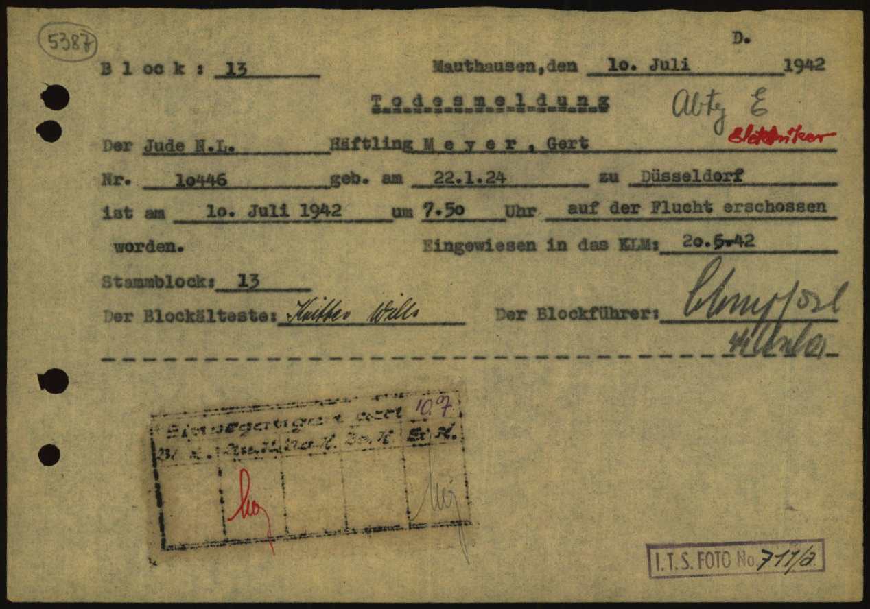 Von dort wurden Gert Meyer und sein Bruder Hans getrennt in das Konzentrationslager Mauthausen deportiert. Sein Bruder Hans Meyer starb am 6. Oktober 1941. Gert Meyer war erst seit dem 20. Juni 1942 im KZ Mauthausen. Der 18-Jährige erhielt die Häftlingsnummer 10446 und war im „Stammblock 13“ untergebracht. Ein Dokument besagt, dass er am 10. Juli 1942 „um 7.50 Uhr auf der Flucht erschossen“ worden sei. Auf diesem Dokument ist als Beruf nachträglich handschriftlich das Wort „Elektriker“ vermerkt worden.