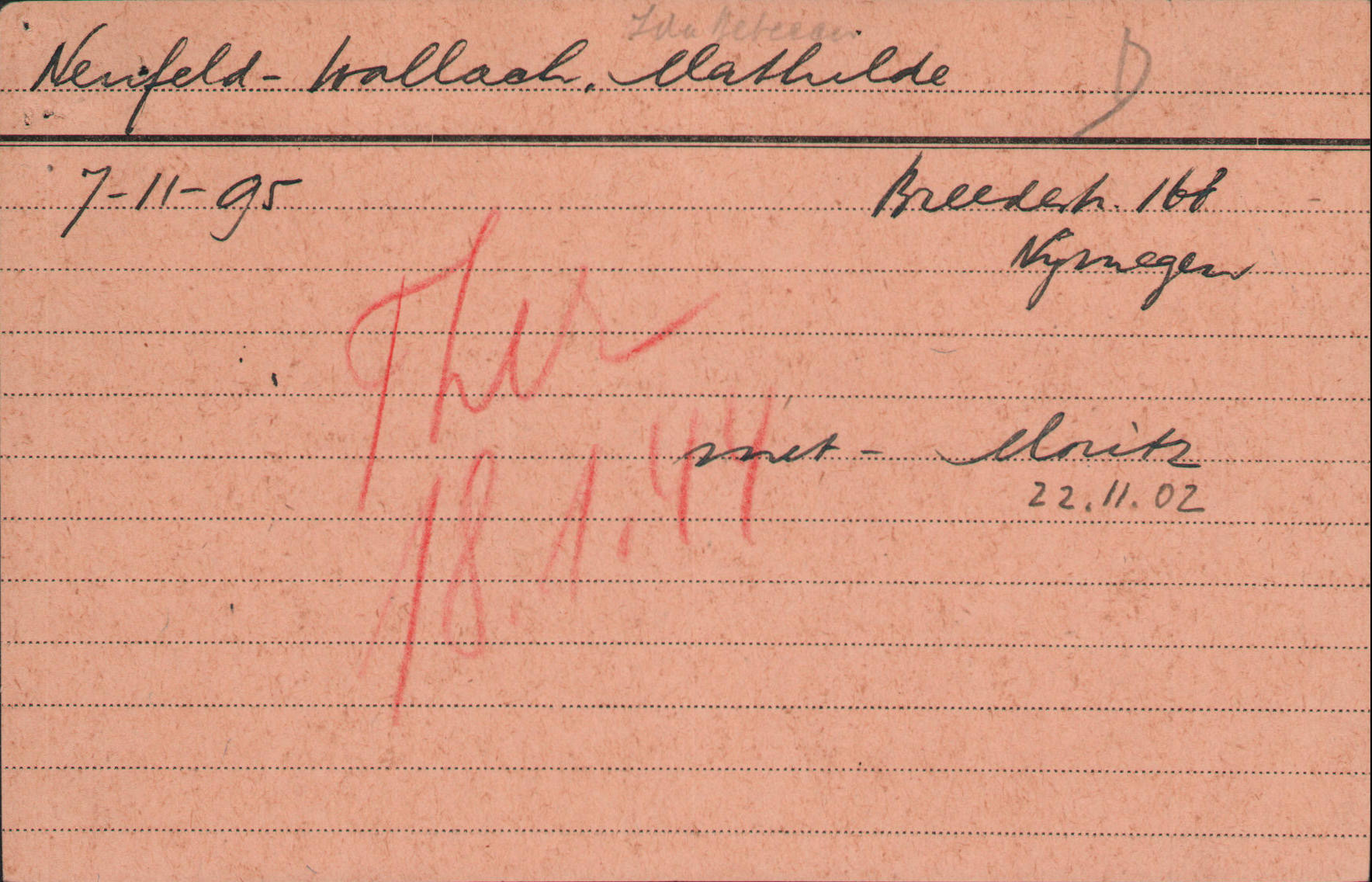 geb. WallachAm 7. November 1895 wurde Mathilde Ida Rebecca Wallach in Düsseldorf geboren. Ihr Vater Samuel Wallach stammte aus Viersen, wo er am 23. Januar 1869 zur Welt gekommen war. Ihre Mutter Mathilde Kahn war am 7. April 1869 in Sobernheim zur Welt gekommen. Ihre Eltern hatten am 30. November 1894 geheiratet.