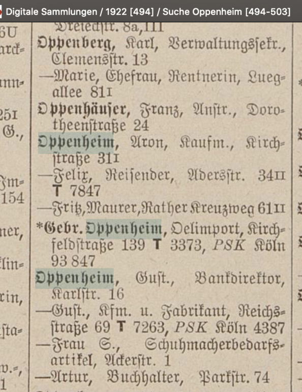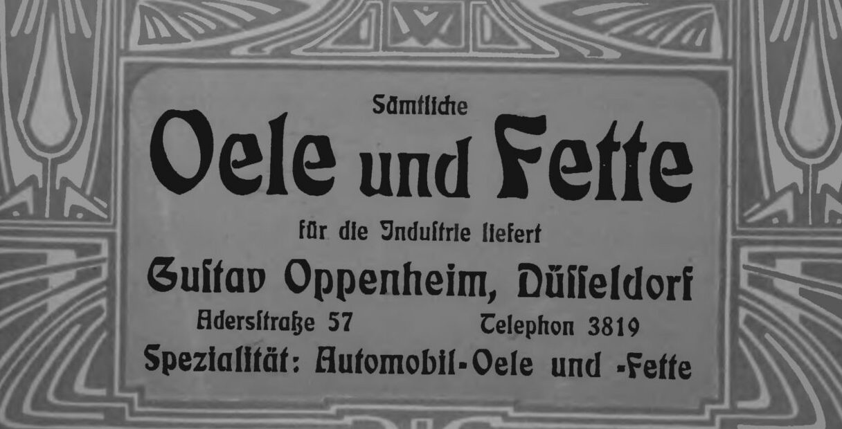 Die Familie Oppenheim wohnte seit dem 1. Juni 1918 in Düsseldorf in der Reichsstraße 69 in einem eigenen Haus. Gustav Oppenheim führte seine Firma, die „Mineral-Öl-Werke Gustav Oppenheim“, und importierte russische und amerikanische Mineralschmieröle. 1933 betrieb er die Firma zusammen mit seinem Bruder Albert Oppenheim („Gebr. Oppenheim, Öle und Fette“) in der Kirchfeldstraße 139 in Düsseldorf.