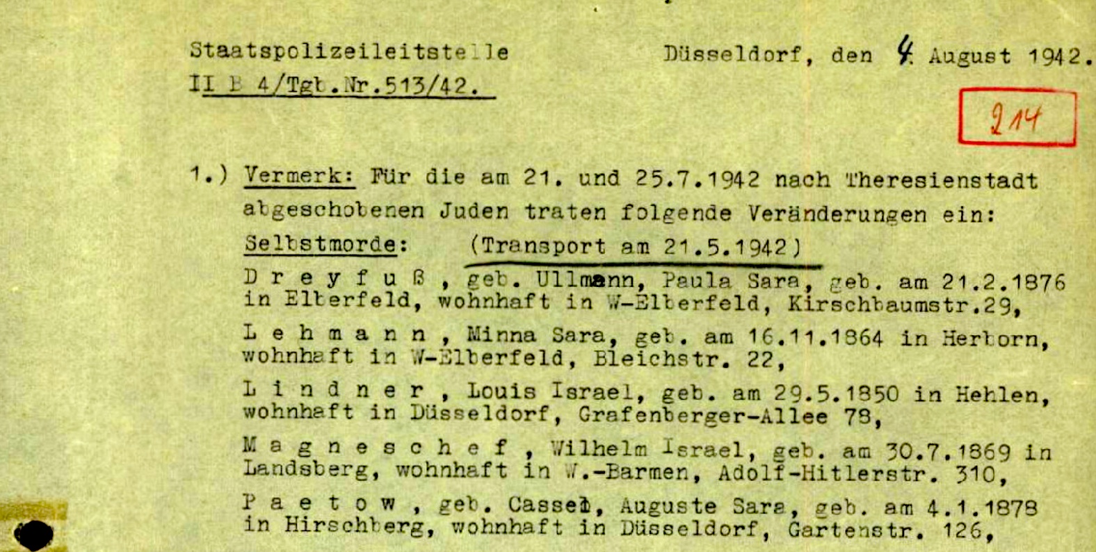 Auguste Paetow erhielt am 18. Juni 1942 die Mitteilung, dass sie in das Ghetto Theresienstadt deportiert werden sollte. Ihr Status als „nichtarische Christin in Mischehe lebend“ galt für die Nationalsozialisten nicht mehr, da Augustes Mann Hans Paetow bereits ein Jahr zuvor im Alter von 75 Jahren verstorben war. Augustes Tochter Ilse wandte sich nach Erhalt des Bescheids in einem Schreiben an den Regierungspräsidenten Düsseldorfs und versuchte, die bevorstehende Deportation ihrer Mutter noch abzuwenden. Ihre Bemühungen blieben jedoch erfolglos. Um der bevorstehenden Deportation zu entgehen, schied Auguste Paetow am 17. Juli 1942 im Alter von 64 Jahren freiwillig aus dem Leben.