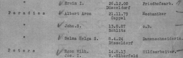 Am 10. November 1941 wurde Albert Paradies mit seiner Frau Johanna und der Tochter Sella Helga von Düsseldorf in das Ghetto Minsk deportiert. Sie haben nicht überlebt.