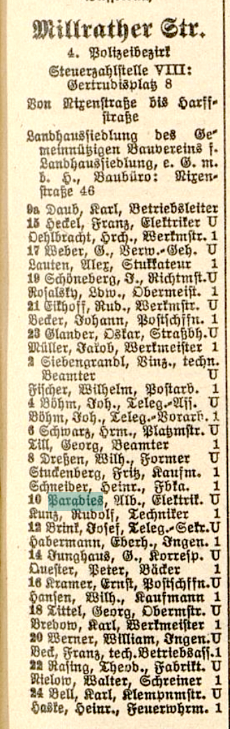 Am 15. April 1935 verstarb seine Mutter Fanni Paradies. Zu Beginn des Jahres 1939 wohnte Albert Paradies mit seiner Familie noch in der Millrather Straße 10. Als Beruf wurde im Düsseldorfer Adressbuch „Elektriker“ angegeben. Das Haus gehörte zu einer Landhaussiedlung des Gemeinnützigen Bauvereins in Düsseldorf-Wersten. Vermutlich hat die Familie aber nach den Ereignissen des Pogroms im November 1938 die Kündigung bekommen. Am 8. Februar 1939 zog Albert Paradies mit seiner Frau Johanna und der Tochter Sella Helga in das Haus der Jüdischen Gemeinde Düsseldorf in der Grafenberger Allee 78. Am 24. März 1939 konnte sich von dort Alberts Tochter aus erster Ehe nach Palästina abmelden.