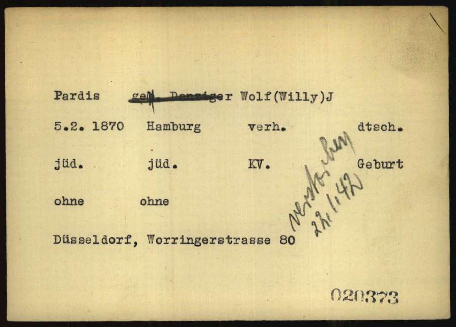 Zuletzt wohnte Selma Pardis/Danziger mit ihrem Mann Willy Wolf Pardis/Danziger in einer Wohnung im 4. Stock des Hauses Worringer Straße 80. Am 22. Januar 1942 verstarb ihr Mann in Düsseldorf.