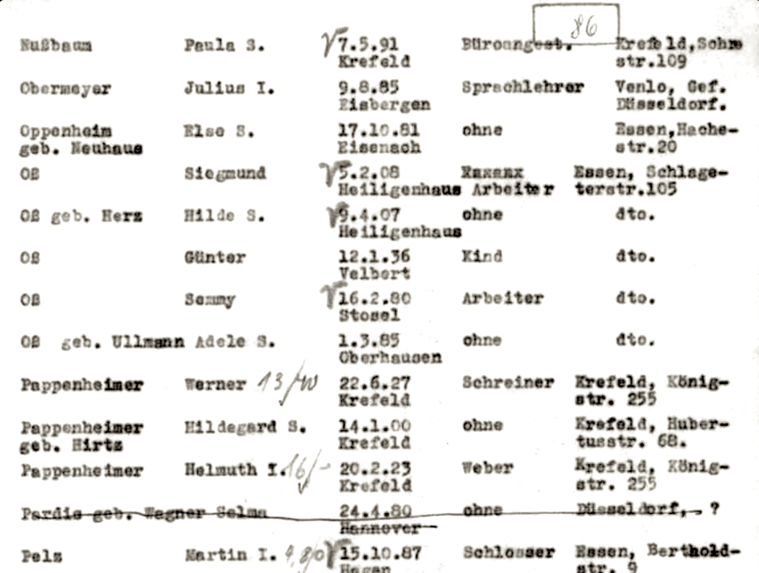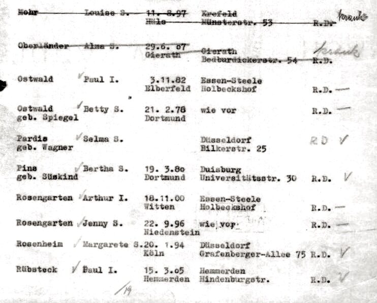 „Am 13.4.42 wurde ich zur Dienststelle der Geheimen Staatspolizei vorgeladen, wo mir eröffnet wurde, dass ich für einen in den nächsten Tagen von Düsseldorf abgehenden Judentransport bestimmt sei. Etwa 2 Tage später wurde auch durch ein Rundschreiben der jüdischen Gemeinde bekanntgegeben, dass der Transport am 22.4.42 stattfindet und dass sich die Transportteilnehmer am 21.2.42 in ihrer Wohnung bereithalten sollten. Ich hatte schon einige Tage vorher das bestimmte Gefühl, dass ich diesen Transport nicht überstehen würde. Über den ganzen Transport hatte ich mir auch schon so viel Gedanken gemacht, dass ich schließlich die Nerven verlor. Nachdem ich alles soweit für den Transport gepackt hatte, bin ich am Montag, den 20.4.42, ich glaube es war gegen 17.30 Uhr aus meiner Wohnung gegangen, um mich in den Rhein zu stürzen. Nachdem ich einige Zeit in der Stadt herumgelaufen war und ich das Gefühl hatte, dass ich nicht den Mut haben würde, mich zu ertrinken, kam ich zu dem Entschluss, mit der Eisenbahn nach Köln zu fahren. Auf die Frage, was ich gerade in Köln wollte, muss ich sagen, dass ich das nicht weiß, ich wollte nur erst einmal aus Düsseldorf fort sein. Bevor ich in Düsseldorf eine Fahrkarte löste, habe ich auf der Frauentoilette des Bahnhofes den Judenstern von meinem Mantel entfernt. Den Stern habe ich deshalb entfernt, weil ich annahm, dass ich sonst keine Fahrkarte bekommen hätte.