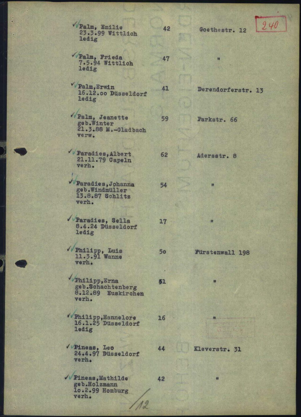 Am 15. Juni 1934 heiratete auch Leo Pineas. Seine Frau Mathilde Holzmann, die auch Tilly genannt wurde, stammte aus Bad Homburg, wo sie am 10. Februar 1899 als Tochter von Isidor und Helene Holzmann, geborene Mayer, zur Welt gekommen war. Am 7. Juli 1934 zog er von seinem Elternhaus in der Elisabethstraße 54 in die Klever Straße 31. Seine Frau zog von Bad Homburg kommend zu ihm am 10. Juli 1934. Sie wohnten in der dritten Etage. Leo Pineas arbeitete als Kaufmann.