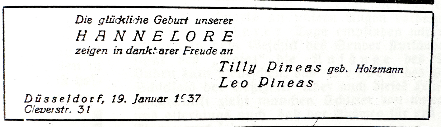Am 4. Juni 1936 zog sein Schwager Ernst Holzmann von der Kaiserswerther Straße 156 zu ihnen in die Klever Straße 31. Er bezog eine Wohnung in der fünften Etage des Hauses. Am 19. Januar 1937 gab es ein schönes Ereignis zu feiern: Leo Pineas Tochter Hannelore wurde geboren. Seine Schwiegermutter Helene Holzmann zog am 25. Juni 1938 mit ihrer erwachsenen Tochter Irma zu ihnen ins Haus Klever Straße 31. Im Zuge des Pogroms im November 1938 wurde Leo Pineas und seine Familie in der Wohnung überfallen. Die Möbel wurden mit Beilen zerschlagen, die Vorhänge zerschnitten und alles durch die zerhackten Fensterkreuze auf die Straße geworfen.