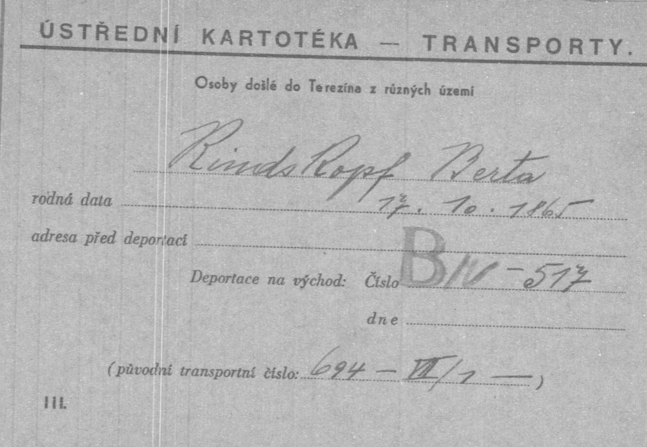 Am 21. Juli 1942 wurde Berta Rindskopf vom Güterbahnhof Düsseldorf Derendorf ins Ghetto Theresienstadt deportiert. Von dort kam sie am 26. September 1942 mit einem Transport ins Vernichtungslager Treblinka, wo sie ermordet wurde.
