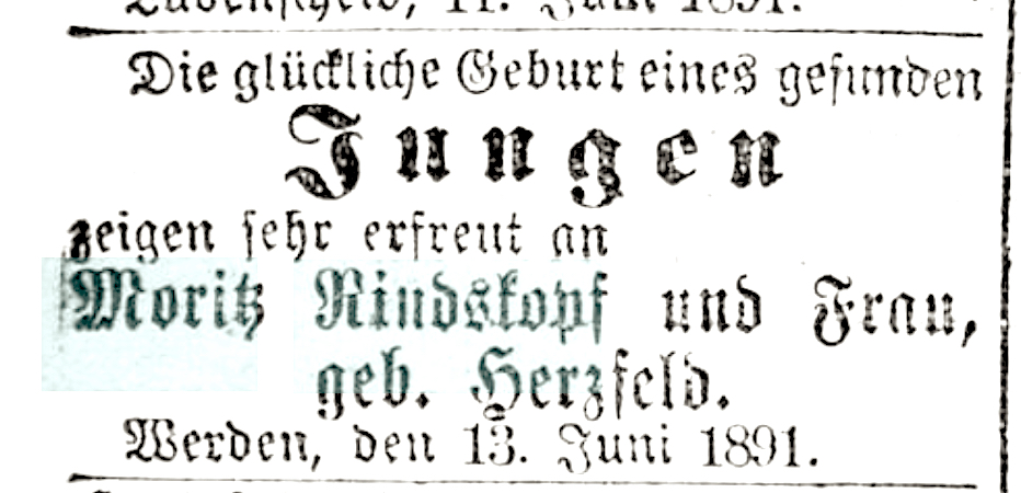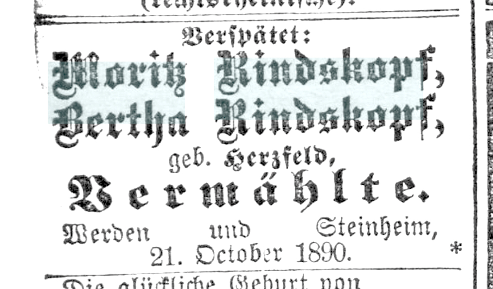Im Juni 1890 verlobte sich Berta Herzfeld mit Moritz Rindskopf in Werden. Ihr Verlobter Moritz Rindskopf war am 11. April 1861 in Essen zur Welt gekommen und hatte zehn Geschwister. Er hatte am 26. März 1889 mit seinem Bruder Otto Rindskopf (1863-1934) in Essen Werden die Firma Gebr. Rindskopf gegründet. Das Unternehmen für Manufakturwaren unterhielt seit 1907 eine Zweigniederlassung in Herne.