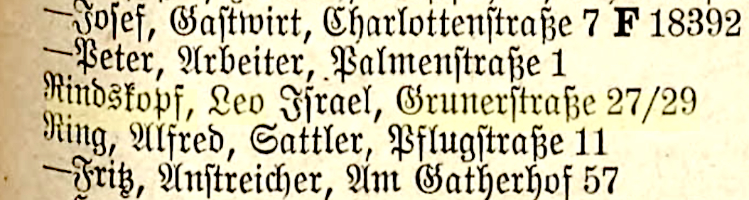 Im Ersten Weltkrieg kämpfte Leo Rindskopf als Obermatrose für die deutsche Marine. Seine Eltern zogen mit ihm 1919 nach Düsseldorf. Die Familie wohnte in der Grunerstraße 17.