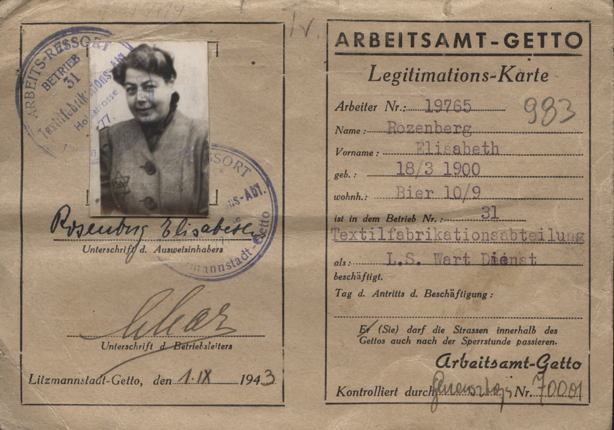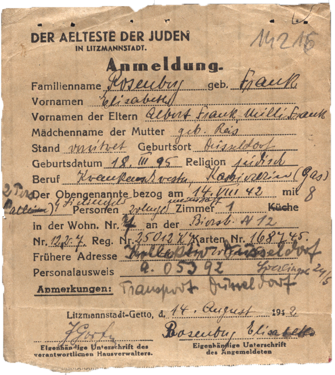 Elsbeth Rosenberg wurde am 27. Oktober 1941 von Düsseldorf in das Ghetto von Litzmannstadt/Łódź deportiert und musste dort mit 88 weiteren Deportierten im Zimmer 11 der Kollektivunterkunft Fischstraße 15 leben. Am 24. Februar 1942 wurde ihr gesamtes Vermögen von den deutschen Behörden beschlagnahmt. Vom „Düsseldorfer Kollektiv“ erhielt sie eine Brotkarte mit der Nummer 168745 und wurde für eine Arbeit im Ghetto als Krankenpflegerin vorgeschlagen. Ab dem 13. März 1942 befand sich Elsbeth Rosenberg auf Anweisung des Präses (also vermutlich wegen einer ghettointernen Bestrafung) im Zentralgefängnis des Ghettos. Ihre Adresse wurde im Haftbuch mit Gnesener Straße 26 angegeben. Dort war das Greisenheim II. Vermutlich hatte oder sollte Elsbeth Rosenberg dort als Krankenschwester arbeiten. Am 28. April 1942 wurde sie um 15 Uhr aus der Haft entlassen. Die Ghetto-Chronik vermerkt an diesem Tag unter der Rubrik „Aus dem Gefängnis“: „Am Dienstag [28.04.1942] betrug die Zahl der im Zentralgefängnis untergebrachten Häftlinge 23. Vor einigen Tag stieg die Zahl beinahe auf 70, dies stand im Zusammenhang mit der Inhaftierung von mehr als fünfzig Personen, die auf der Liste der Neueingestellten einer der Arbeitsstätten beanstandet worden waren. Nach der durchgeführten Kontrolle der Arbeitsausweise wurde diese Gruppe entlassen.“