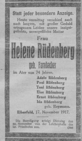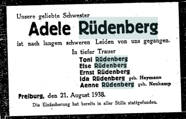 Ende des Jahres 1937 hatte (auch) ihre Schwester Toni das Geschäft in Bad Oeynhausen „arisieren“ müssen. Sie zog am 8. Januar 1938 von Bad Oeynhausen nach Neuss, Further Straße 84, zur Familie ihrer Verwandten Helene Seckelson, geborene Rüdenberg (1875-1959). So waren wenigstens in der schweren Zeit ein Teil der Geschwister wieder enger zusammen. Am 21. August 1938 verstarb in Freiburg ihre Schwester Adele Rüdenberg im Alter von 66 Jahren. Eine Quelle bezeichnet ihren Tod als Suizid. In der C.V. Zeitung vom 1. September 1938 erschien eine Todesanzeige mit folgendem Text: „Unsere geliebte Schwester Adele Rüdenberg ist nach langem schweren Leiden von uns gegangen. In tiefer Trauer Toni Rüdenberg, Else Rüdenberg, Ernst Rüdenberg, Ida Rüdenberg, geb. Heymann, Aenne Rüdenberg, geb. Neukamp. Freiburg, den 21. August 1938. Die Einäscherung hat bereits in aller Stille stattgefunden.“ Adele Rüdenberg wurde nach Wuppertal überführt und auf dem jüdischen Friedhof Weinberg in der Nähe ihrer Eltern begraben.