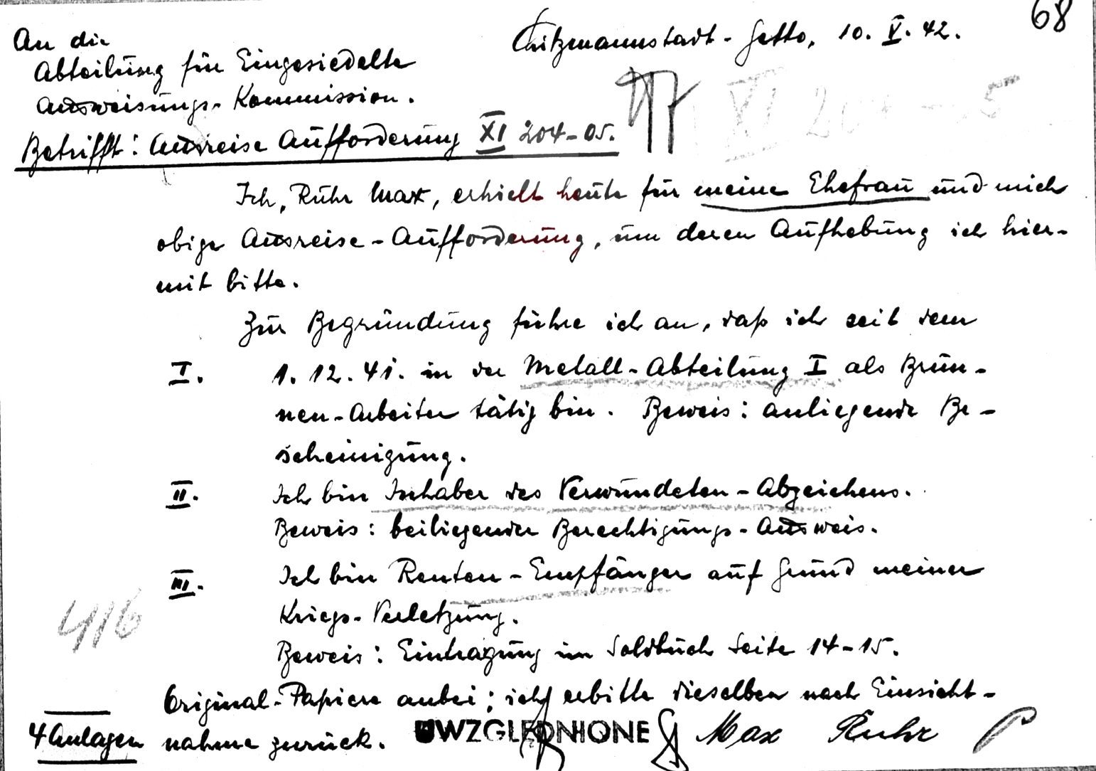 Max Ruhr wurde am 27. Oktober 1941 zusammen mit seiner Frau und der Familie seines Bruders Alfred von Düsseldorf in das Ghetto von Litzmannstadt/Łódź deportiert. Dort mussten sie zunächst mit weiteren Deportierten im Zimmer 5 der Kollektivunterkunft Fischstraße 15 leben. Max Ruhr arbeitete im Ghetto seit dem 1. Dezember 1941 in der Metallabteilung I als Brunnenarbeiter. Bis April 1942 erhielt er weiterhin seine Kriegsversehrten-Rente in Höhe von 58,45 RM in das Ghetto überwiesen. Durch ein Schreiben an die „Aussiedlungskommission“ des Amtes für Eingesiedelte konnte Max Ruhr am 10. Mai 1942 unter Hinweis auf seine Verdienste im Ersten Weltkrieg erreichen, dass er und seine Ehefrau von der Deportation mit dem XI. Transport am 14. Mai 1942 zurückgestellt wurden. Danach konnten sie am 22. Mai 1942 aus den aufgelösten Kollektivunterkünften mit insgesamt fünf Personen in ein Zimmer der Wohnung 3 in der Mühlgasse 4 umziehen. Max Ruhr verstarb am 8. Juli 1942 im Ghetto von Litzmannstadt/Łódź. Als offizielle Todesursache wurde „fieberhafter Darmkatarrh“ angegeben.