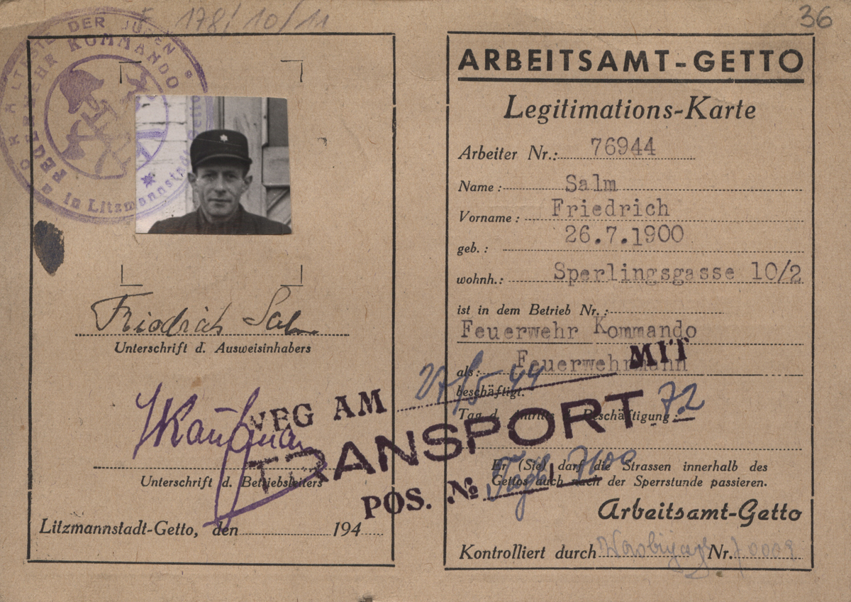 Im Ghetto wurden sie mit weiteren Deportierten im Zimmer 7 der Kollektivunterkunft Fischstraße 15 untergebracht. Über das „Düsseldorfer Kollektiv“ erhielt er die Brotkarte mit der Nummer 168782. Friedrich Salm arbeitete seit dem 1. Dezember 1941 als Feuerwehrmann beim Feuerwehrkommando des Ghettos. Seine Arbeiternummer dort lautete 76944. Er und seine Familie wurden von der Deportation mit dem XI. Transport am 14. Mai 1942 wegen „Arztangelegenheiten“ zurückgestellt.
