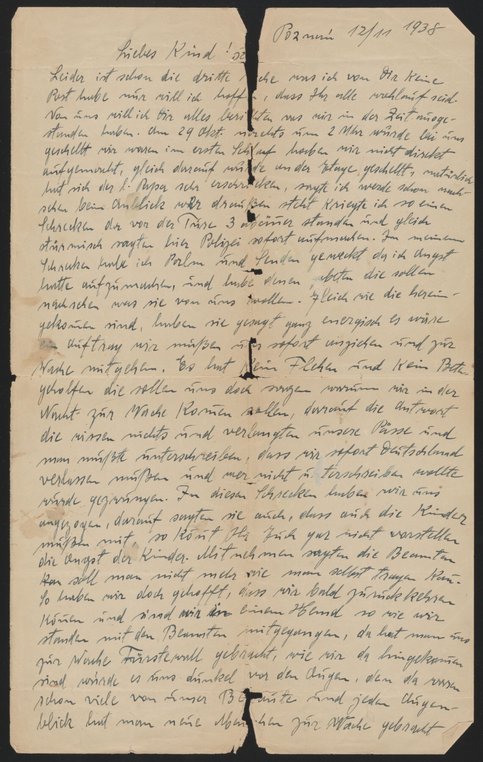 Am 28. Oktober 1938 wurde die Familie Salpeter zusammen mit anderen vormals polnischen Juden aus Düsseldorf an die deutsch-polnische Grenze abgeschoben. Am 31. Oktober 1938 schrieb Bronia Salpeter aus Posen an Klara: „Liebes Kind, sorge Dich nicht um uns, ich bin glücklich, dass Du nicht dabei warst“ und Rika schrieb auf die Postkarte: „Heute sind wir in Polen angekommen. Ich kann Dir nicht viel schreiben, da ich sehr müde bin.“ Am 4. November 1938 schrieb Bronia Salpeter aus Posen: „Meine Lieben! Leider sind wir seit dem 28. Oktober vertrieben ohne etwas mitnehmen zu können, wie gesagt in einem Hemd sodass es für uns jetzt sehr bitter ist.“ Und am 12. November 1938 schrieb Bronia Salpeter sehr ausführlich über die erfolgte Ausweisung, die als „Polenaktion“ in die Geschichte eingegangen ist: „Am 29. Oktober nachts um 2 Uhr wurde bei uns geschellt, wir waren im ersten Schlaf und haben wir nicht direkt aufgemacht, gleich darauf wurde an der Etage geschellt, natürlich hat sich der liebe Papa sehr erschrocken, sagte ich werde schon nachsehen, beim Anblick wer draußen steht, kriegte ich so einen Schrecken dar vor der Türe 3 Männer standen und gleich stürmisch sagten, hier Polizei sofort aufmachen. (Gleich wie die hereingekommen sind, haben sie gesagt ganz energisch es wäre ein Auftrag, wir müssen uns sofort anziehen und zur Wache mitgehen. Es hat kein Flehen und kein Beten geholfen, die sollen uns doch sagen warum wir in der Nacht zur Wache kommen sollen, darauf die Antwort, die wissen nichts und verlangten unsere Pässe und man musste unterschreiben, dass wir sofort Deutschland verlassen mussten und wer nicht unterschreiben wollte wurde gezwungen. In diesem Schrecken haben wir uns angezogen, darauf sagten sie auch, dass auch die Kinder müssen mit, so könnt Ihr Euch gar nicht vorstellen die Angst der Kinder. Mitnehmen sagten die Beamten soll man nicht mehr wie man selbst tragen kann. (…) da hat man uns zur Wache Fürstenwall gebracht, wie wir da hingekommen sind wurde es uns dunkel vor den Augen, denn da sassen schon viele von unseren Bekannten und jeden Augenblick hat man neue Menschen zur Wache gebracht. Von da aus hat man uns ins Polizeigefängnis gebracht, inzwischen waren es einige Hundert Menschen gewesen, jede in Zellen untergebracht. Die ganze Nacht haben wir so verbracht endlich wie es hell wurde hat man uns in die Reihe gestellt und im Hof unter strenger Bewachung die Namen verlesen, aber noch immer nicht gesagt, was mit uns geschehen soll. Dann mussten wir wieder in die Zellen zurück, natürlich ohne Essen und Trinken, dann die haben etwas hereingegeben, aber man war nicht imstande etwas herunter zu kriegen und so hat man verbracht bis Freitag Abend 6 1/2 Uhr hiess es wieder wir kommen heraus und wurden wieder unter Bewachung aufgestellt aber immer noch nicht gesagt wohin wir kommen. Gleich darauf kamen große Polizeiwagen und so sind nach der Reihe in Wagen gekommen und zuerst wurde jeder untersucht ob man Geld bei sich hat. Jedem wurde alles abgenommen was man bei sich hatte, ich hatte 1700 RM bei mir da ich denselben Tag beim Nord Deutschen Lloyd unsere Karten bezahlen wollte (…) ich sagte zu den Beamten, dass sie es mir nicht abnehmen sollen, da wir bald nach Amerika fahren und das Geld für Karten bestimmt sei. Es half nichts, haben es abgenommen und mir für jeden 10 RM gegeben. Bald darauf haben sie uns mit Wagen zur Bahn gebracht und jeden unter den Arm ein Brot gedrückt wie die ganz schweren Verbrecher, gegen 7 Uhr waren alle Menschen, die sie mitgenommen haben im Zug, unter strenger Bewachung ist der Zug abgefahren. So sind wir die ganze Nacht gefahren, ohne Essen und Trinken, denn das trockene Brot konnte man nicht herunterkriegen, und Fenster oder Tür konnte man nicht aufmachen. Um 9 Uhr morgens, das war Schabes früh, sind wir an der Polnischen Grenze angekommen. Da hat man uns erst vom Zug herausgelassen, jedem seinen Pass wiedergegeben, auf der anderen Seite stand ein Polnischer Zug, der hat uns eine Station weiter mitgenommen, viele unserer Leidensgenossen mussten dann 3-4 Stunden zu Fuß den Weg laufen bis sie die polnische Grenze erreicht haben, zu Tode abgemattet kamen wir nach Zbaszyn an, inzwischen waren es von allen Teilen Deutschlands 5-6 Tausend Menschen da. Da hat man uns in Baracken untergebracht und man sorgte auch für essen. Vor Müdigkeit lag man in den Baracken eingequescht wie die Heringe, (…) Bis Sonntagmittag haben wir uns so im Freien aufgehalten bis wir endlich nach Posen weiter gefahren sind. In Posen angekommen hat sich das Komitee unser angenommen und versorgt für Essen und Quartier. In Posen sind noch heute über 500 Emigranten und Zbaszyn sind noch heute 5.500, jetzt darf man nicht von Zbaszyn raus, bis die Regierung es erlauben wird.“