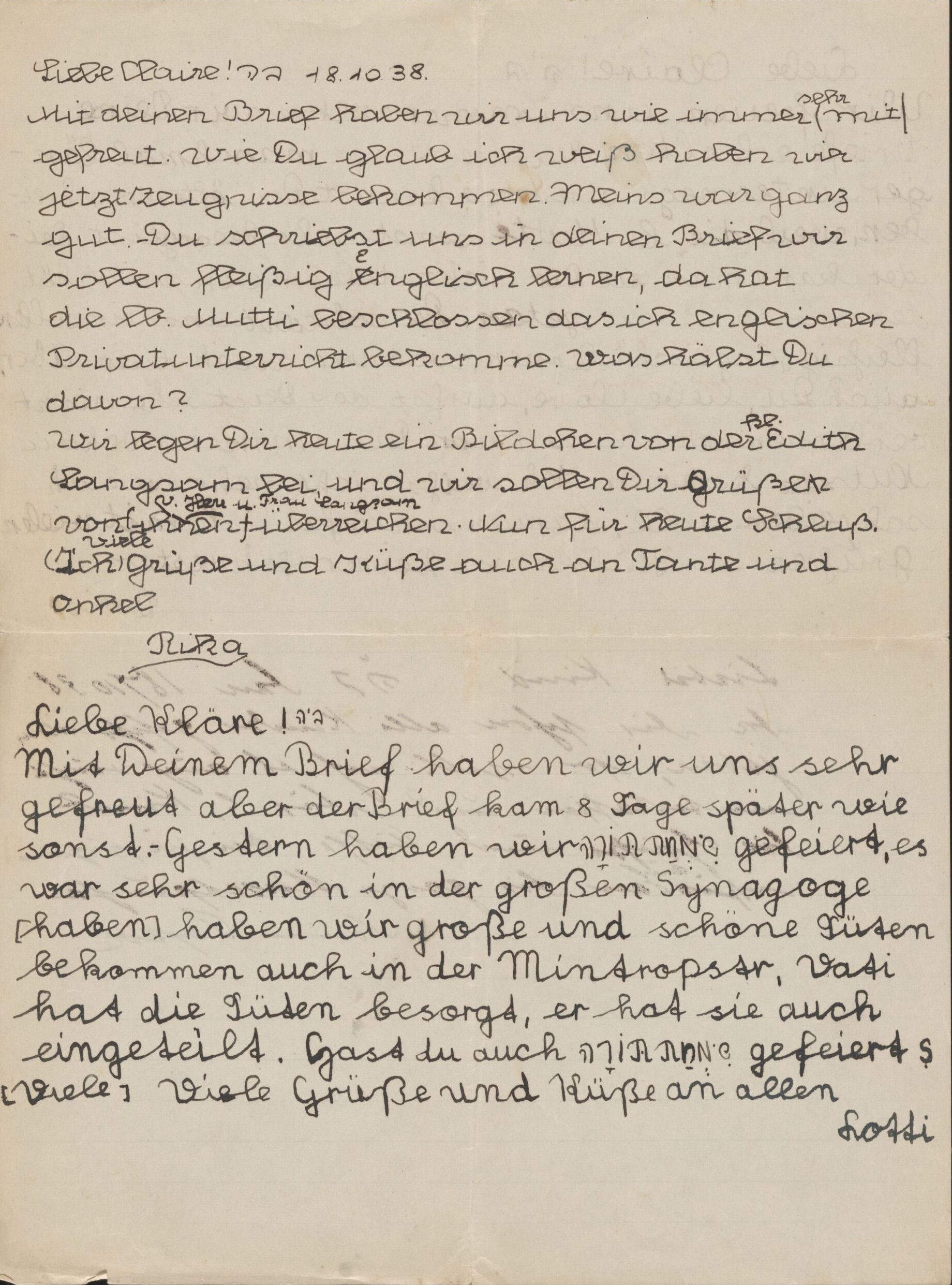 Nach Doras Entlassung aus dem Krankenhaus schrieben sie am 21. Dezember 1938 über ihre Bemühungen, zu Klara/Cläre nach Amerika zu kommen, Lotte ergänzte auf dem Brief „Wir hoffen Dich bald wieder zu sehen. Hier ist es sehr kalt.“ Und ihre Schwester Dora ergänzte: „Wie Du siehst bin ich wieder aus dem Krankenhaus. Mir geht es G.s.D. wieder gut. Wir wohnen jetzt bei sehr netten Leuten, hoffentlich kommt der liebe Vati und Rika bald nach Posen zurück.“