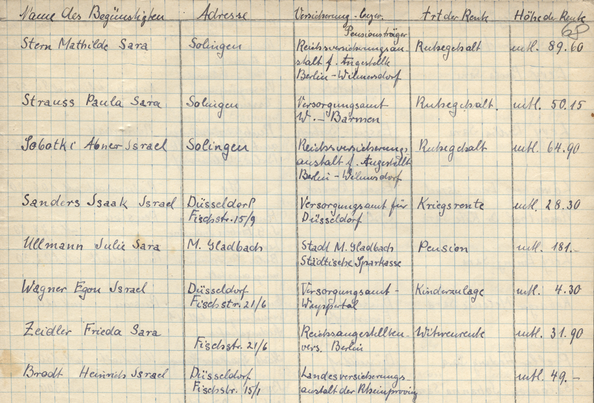 Am 28. Oktober 1939 zogen sie von dort nach Düsseldorf in das sogenannte „Judenhaus“ Geibelstraße 39 im Stadtteil Grafenberg. Zuletzt musste Isidor Isaak Sanders in Düsseldorf Zwangsarbeit leisten, sein Arbeitsbuch hatte die Nummer 179/23285. In der von den Nationalsozialisten 1941 kurz vor der Deportation erzwungenen Vermögenserklärung gab er ein Sparbuch bei der Städtischen Sparkasse Düsseldorf an.