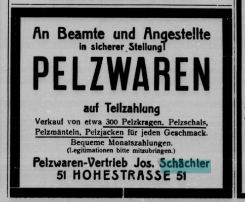 Die Familie Schächter wohnte in Düsseldorf in der Graf-Adolf-Straße 49/53 und später in einem Haus am Karlplatz 24. Josef Schächter unterhielt mehrere Pelzwarenhäuser in Düsseldorf. 1928 befand sich das Hauptgeschäft in der Hohe Straße 51. Später unterhielt die Familie eine Filiale in der Königsallee 72. I. In der Ausgabe vom 21. Januar 1933 vermeldete der Deutsche Reichsanzeiger: „In dem Konkursverfahren über das Vermögen des Kaufmanns Josef Schächter in Düsseldorf, (…) Inhaber zweier unter der Firma Pelzwarenspezialhaus Josef Schächter betriebenen Pelzwarengeschäfte in Düsseldorf, Königsallee 72, und Duisburg, Königstr. 46, ist der Eröffnungsbeschluss vom 22. Dezember 1932 dahin ergänzt, dass sich das Konkursverfahren auch auf das unter der Firma A. Richter in Bielefeld, Obernstr. 39, betriebene Pelzwarengeschäft erstrebt.
