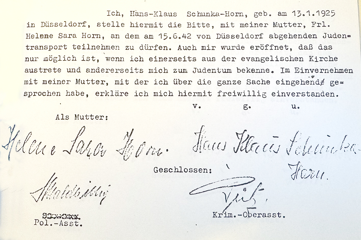 Im Juni 1941 wurde seine Mutter wieder denunziert. Die Gestapo schrieb am 3. Juni 1941: „Es wurde bekannt, dass die Jüdin Horn (…) noch einen Fernsprechanschluss hat. (…) Sie hat ein Kind im Alter von 16 Jahren (…) Schunka war deutschblütig (…) Da das Kind bei der Geburt evangelisch getauft wurde, gilt es als Mischling 1. Grades und wird nicht dem Judentum zugerechnet. Der bestehende Fernsprechanschluss wird gekündigt. In Verlaufe der weiteren Feststellungen ergab sich, dass die Jüdin Horn für verschiedene Düsseldorfer Rechtsanwälte und Notare schriftliche Arbeiten als Heimarbeit verrichtet (…) Aus diesem Grunde wurde ihr aufgegeben, sich zum jüdischen Arbeitseinsatz zu melden…und auf den Namen Klaus Schunka-Horn lautende Gewerbe sofort abzumelden.” Seine Mutter antwortete am selben Tag in einem Schreiben an die Gestapo: „…mein Junge ist Schlosser- und Schweisserlehrling im dritten Lehrjahre im Autogenwerk Sirius und bringt wöchentlich 8 bis 10 RM mit nach Hause. Zu seiner Ausbildung besucht er die Fachschule in der Charlottenstraße an 3 Abenden der Woche. Ich könnte das Kind, der doch nach seinem verstorbenen Vater Mischling ersten Grades ist, weder ernähren noch kleiden, wenn ich mein Gewerbe nicht mehr ausüben dürfte. Wir zwei stehen in Europa ganz alleine. 4 Brüder, 4 Schwägerinnen und meine Mutter sind in New York, wohin wir nach Kriegsschluss ebenfalls auswandern wollen. (…) Ich habe drei Brüder kriegsfreiwillig im Weltkrieg gehabt…der letztere erhielt als Maschinengewehrschütze in Cambrai das EK. II. Unter Berücksichtigung alles dessen spreche ich die herzliche Bitte aus, doch unser Lebensschicksal wohlwollend zu berücksichtigen und mir die Möglichkeit zu geben, den Jungen und mich durch meiner Hände Arbeit wenigstens so lange ernähren zu dürfen, bis wir entweder auswandern können, oder aber, bis das Kind seine Lehre aus hat.“ Doch der Gestapobeamte Georg Pütz war keineswegs wohlwollend, sondern hielt sofort ein zweites „Vergehen“ fest: „5. Juni 1941 Vermerk. Wegen Verstoßes gegen die Kennkartenbestimmung wurde die Jüdin Horn ernstlich belehrt und gewarnt (Kennort und Kennnummer nicht angegeben).“