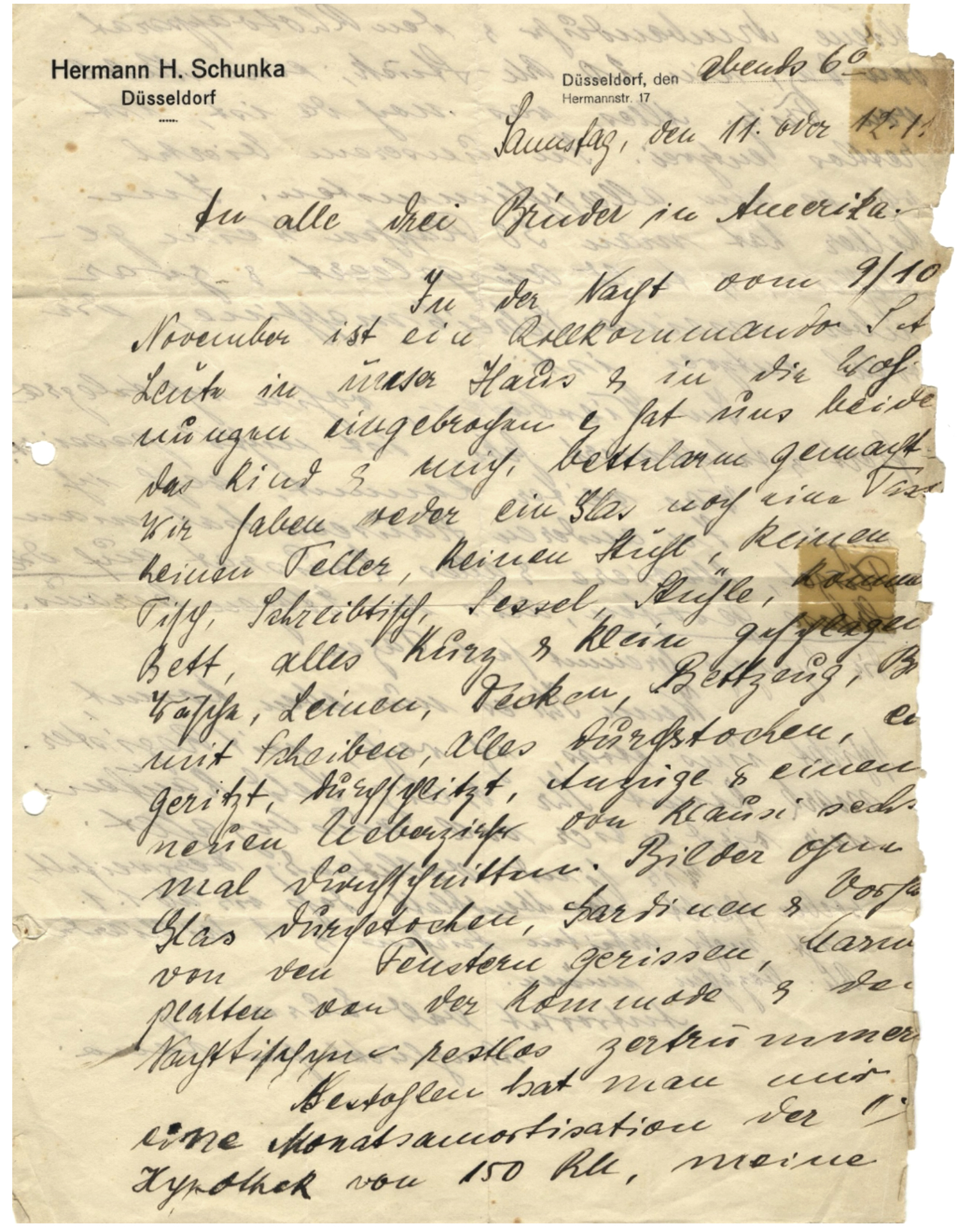 In Wiesbaden, wohin ich telegrafiert und telefoniert habe, ist nichts passiert. Was weiter kommt, weiss ich nicht. In anderen Häusern hat man Flügel, Klaviere und alles Hausrat auf die Straße geworfen, aus den Etagen heraus. Die Synagoge brennt seit Tagen. Wenn Ihr es nur eben könnt, schickt uns etwas, ich weiss, mit Registermark könnt Ihr billig Geld kaufen, mir wird es hier voll ausbezahlt.