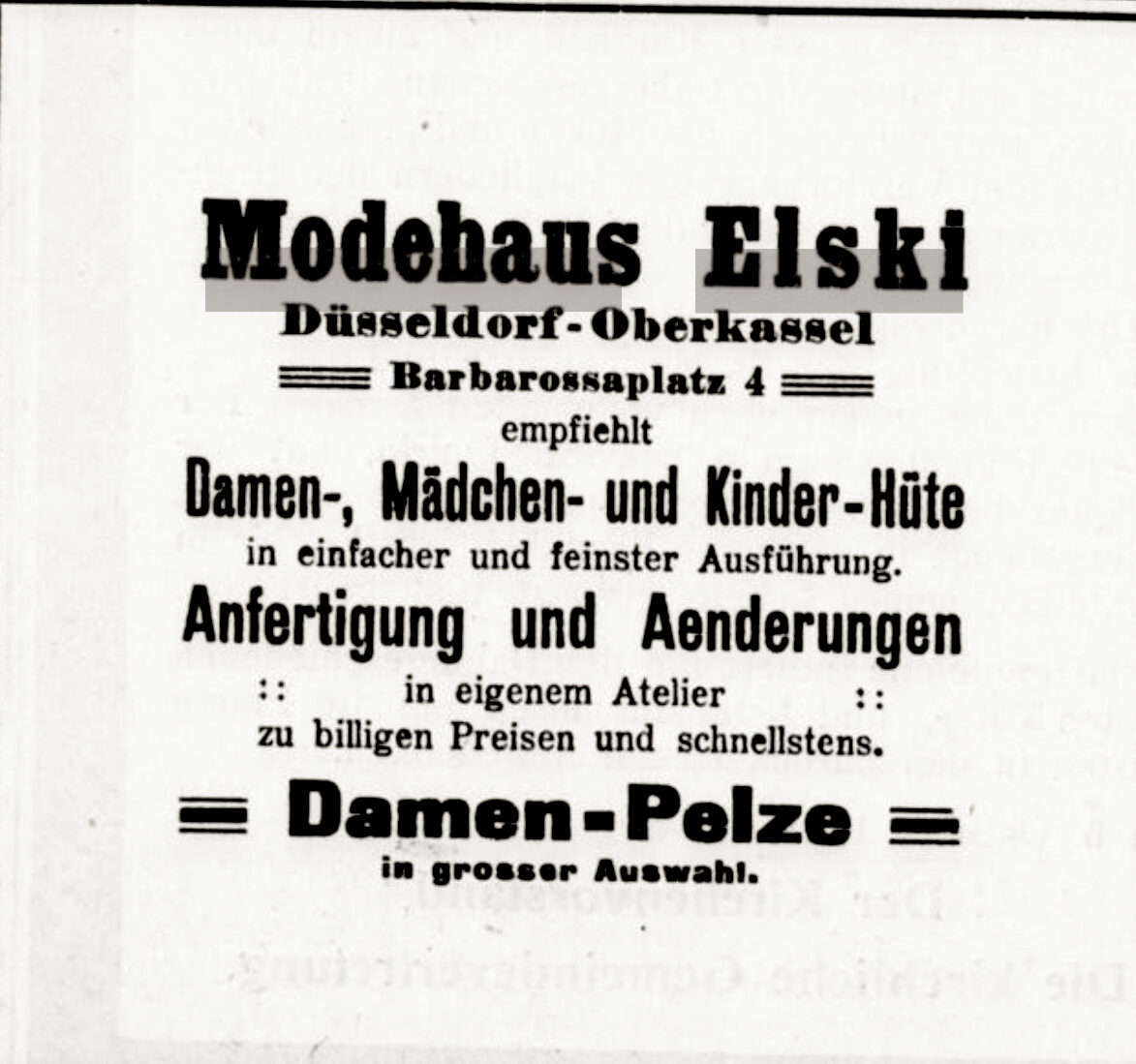 Clara Israelski führte das Modehaus Elski in Düsseldorf Oberkassel. 1911 befand es sich am Barbarossaplatz 4. Im Handelsregister wurde als Geschäftszweig „Putz-, Pelzwaren- und Modeartikel-Geschäft“ vermerkt.