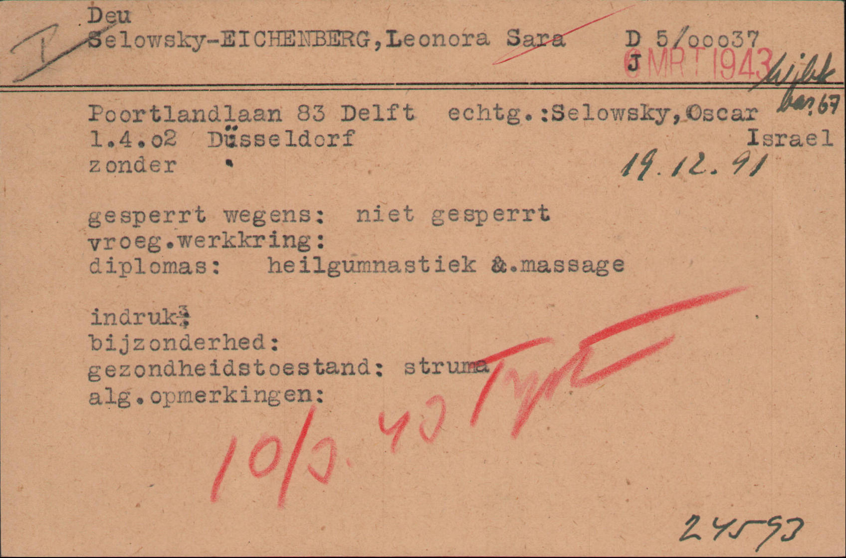 Ab dem 6. März 1943 befand sich Eleonore (Leonora) Selowsky im Durchgangslager Westerbork. Sie kamen dort in die Baracke 67. Die gesamte Familie Selowsky wurde am 10. März 1943 aus dem Durchgangslager Westerbork in das Vernichtungslager Sobibor deportiert und nach der Ankunft ermordet.