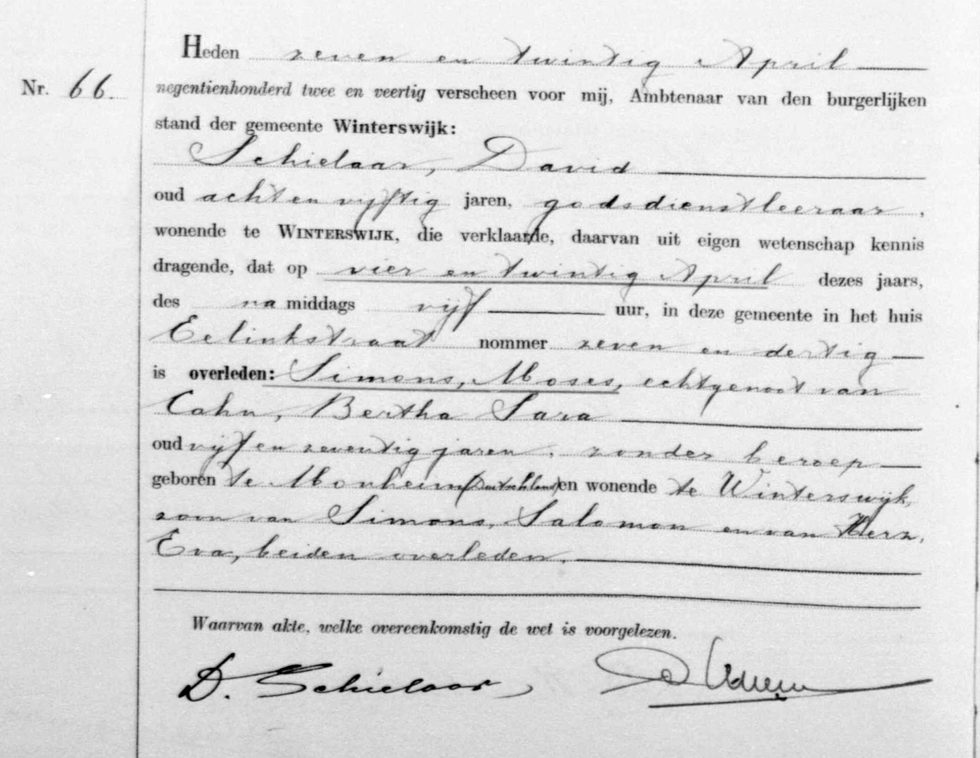Kurz vorher, am 24. April 1942, war Moritz Simons in Winterswijk im Alter von 75 Jahren verstorben. Berta Simons war nun ganz auf sich allein gestellt. Ihre letzte Adresse in Winterswijk war Misterstraße 95. Das Haus gehörte einer jüdischen Familie namens Gans. Die 71-jährige Berta Simons wurde, vermutlich über das Durchgangslager Westerbork, aus den Niederlanden am 24. November 1942 in das Vernichtungslager Auschwitz deportiert und dort nach der Ankunft am 27. November 1942 ermordet.