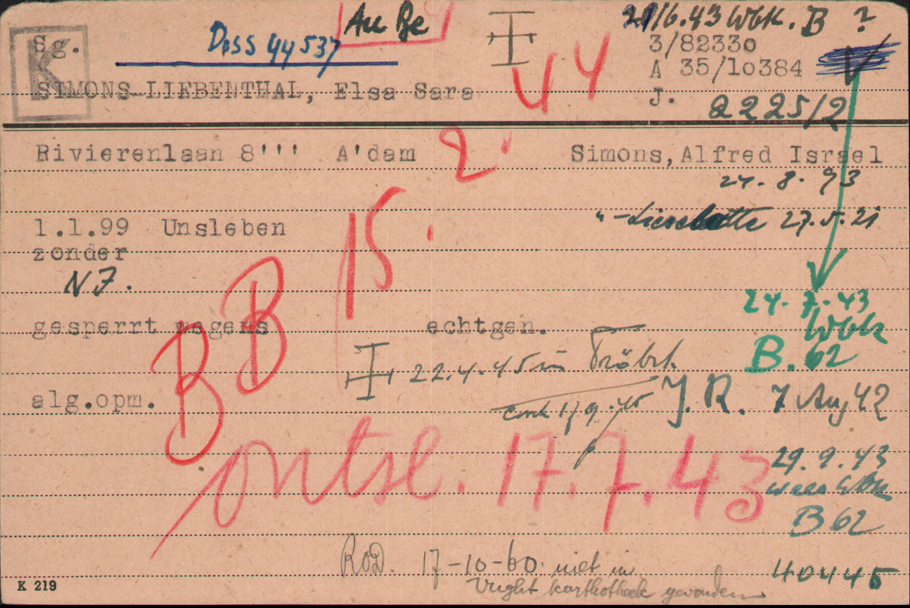 Erst ab dem 14. Februar 1939 war ihr Schwiegervater offiziell als ihnen in der van Eeghenstraat 187 in Amsterdam wohnend von den niederländischen Behörden verzeichnet worden. Sie zogen alle zusammen am 30. Mai 1941 zur Rivierenlaan 8 III.