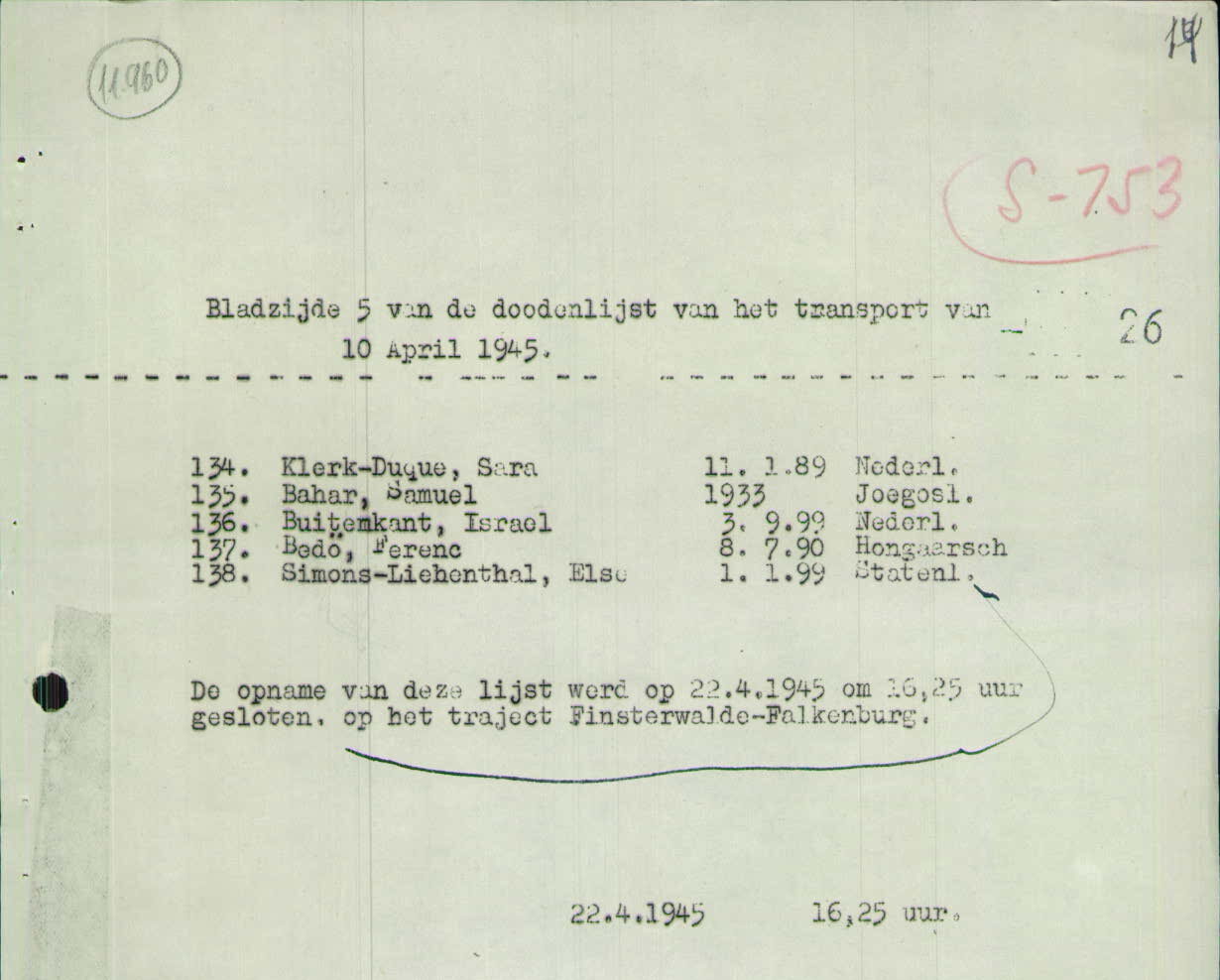 Else Simons überlebte diese unmenschliche Situation nicht. Sie starb am 22. April 1945 in dem Zug bei Tröbitz (Falkenberg, Elster). Ihr Mann überlebte und wurde einen Tag später aus dem Zug, der an einer gesprengten Eisenbahnbrücke in Tröbitz an der Elster gestoppt worden war, von ukrainischen Soldaten der Roten Armee befreit. Er kehrte 1946 nach Amsterdam zurück.