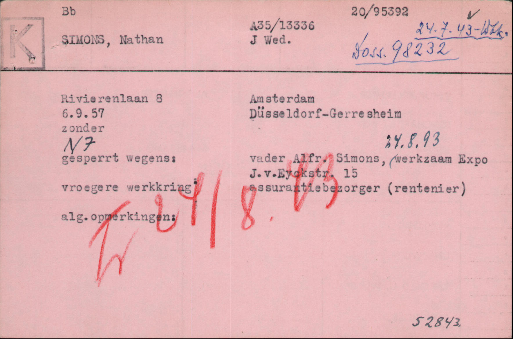 Nathan Simons blieb zunächst in Düsseldorf in seinem Haus in der Gneisenaustraße 28 b. Später emigrierte auch Nathan Simons mit seiner Frau in die Niederlande. Sie wohnten bei ihrem Sohn in der Stadionkade 41. Am 3. Juni 1937 verstarb seine Frau Isabella Simons in Amsterdam. Erst ab dem 14. Februar 1939 war Nathan Simons offiziell als bei seinem Sohn in der van Eeghenstraat 187 in Amsterdam wohnend von den niederländischen Behörden verzeichnet worden. Auf seiner Einwohner-Meldekarte wurde mit Datum 1. Dezember 1939 „Opgen BR“ vermerkt. Der nächste Eintrag betrifft seinen Umzug, zusammen mit seinem Sohn und der Schwiegertochter, am 30. Mai 1941 zur Rivierenlaan 8 III. Auf der Karte wurde am 11. September 1941 „PB 13336“ vermerkt.