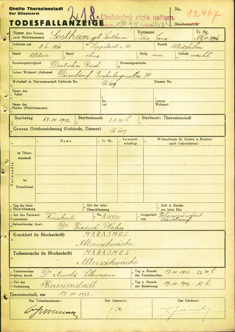 Am 27. März 1942 zog Ida Sostheim von der Bilkerstraße 25 in ein Zimmer im Altenheim der Jüdischen Gemeinde in die Grafenberger Allee 78. Am 21. Juli 1942 wurde sie vom Güterbahnhof Düsseldorf Derendorf in das Ghetto Theresienstadt deportiert. Dort wurde sie in das Gebäude Q 609 einquartiert. Ida Sostheim verstarb dort am 17. November 1942. Sie wurde 82 Jahre alt.
