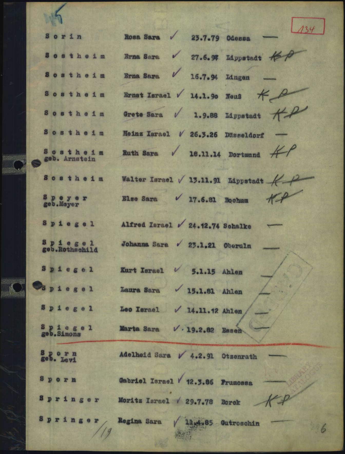 Ruth Sostheim und ihr Ehemann Walter wurden am 27. Oktober 1941 in das Ghetto von Litzmannstadt/Łódź deportiert. Auch ihre Mutter Lina Küper, die nach dem Tod ihres Mannes ein weiteres Mal geheiratet hatte, befand sich im Ghetto. Sie war aus Köln bereits am 22. Oktober 1941 mit dem ersten Kölner Transport in das Ghetto deportiert worden. Sie wohnte im Ghetto in der Sulzfelderstraße 63/77. Ruth Sostheim war dagegen mit ihrem Mann in der „Düsseldorfer Kollektivunterkunft“ in der Fischstraße 15 im Zimmer 8 untergebracht worden. Über das „Düsseldorfer Kollektiv“ erhielt sie auch ihre Brotkarte mit der Nummer 168848.