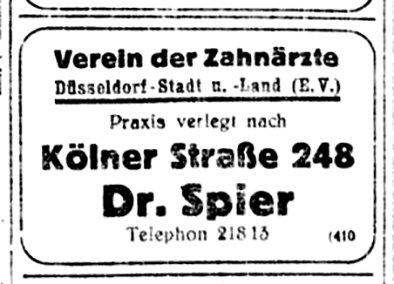 Im Ersten Weltkrieg leistete er Kriegsdienst als Feldzahnarzt und wurde mit dem Eisernen Kreuz II. Klasse ausgezeichnet. Nach seiner Rückkehr nach Düsseldorf 1919 eröffnete er 1920 eine Zahnarztpraxis in der Kölner Straße 248. Ein Jahr später wurde er an der Universität Würzburg zum Doktor der Zahnmedizin promoviert. Ein knappes Jahr nachdem sein Vater in Würzburg 1927 verstorben war, zog seine Mutter Johanna Spier im Mai 1928 zu ihm nach Düsseldorf.