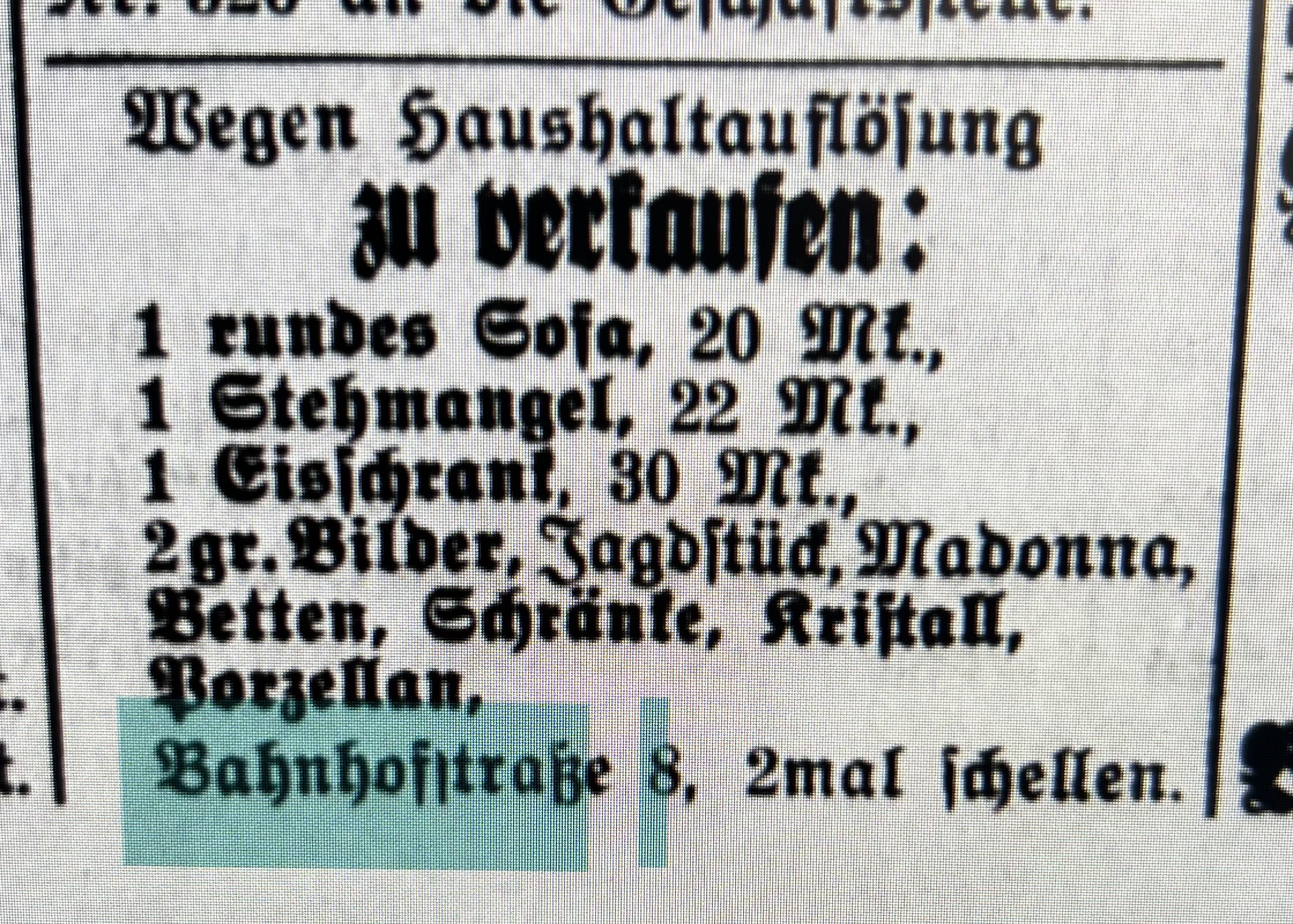 1939 zog Regina Tischler aus Honnef wieder nach Düsseldorf. Möglicherweise zog sie als Folge des zunehmenden sozialen Drucks auf die zahlenmäßig kleine jüdische Gemeinde nach Düsseldorf. Am 1. Februar 1939 inserierte sie die erste Anzeige zur Haushaltsauflösung in der Honnefer Volkszeitung. Am 1. April 1939 setzte Regina Tischler auch den Eisschrank, die Oefen, Betten, Kommoden und weitere Dinge in die Zeitung unter dem Stichwort „Wegen Haushaltauflösung billig abzugeben“.