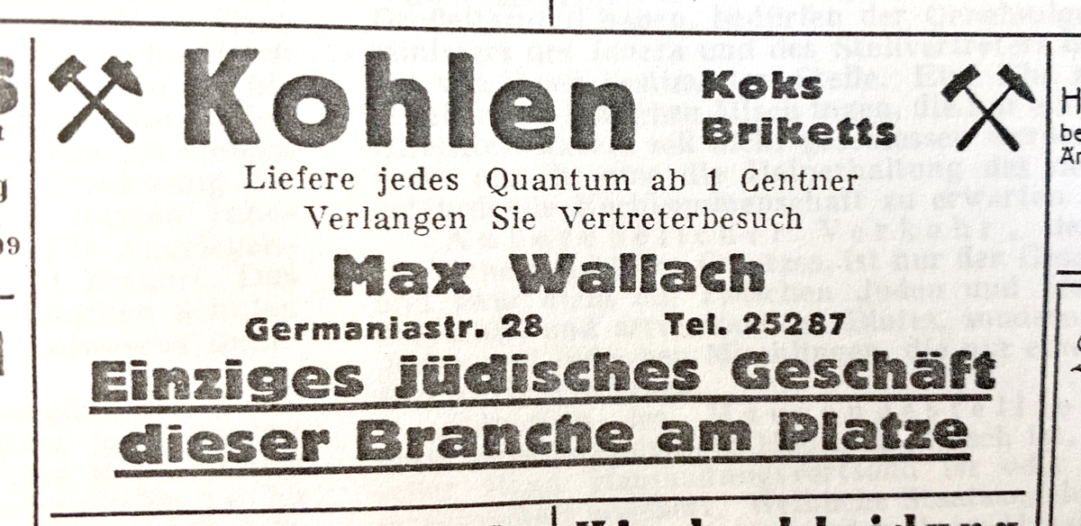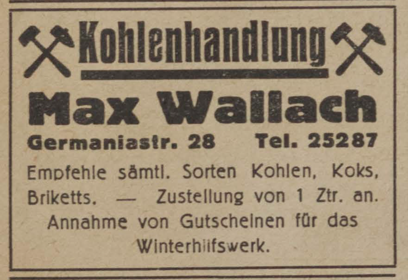 Max Wallach kämpfte im Ersten Weltkrieg und wurde so schwer verwundet, dass ihm ein Bein amputiert werden musste. Ihm wurde das Eiserne Kreuz II. Klasse verliehen. Max Wallach erhielt in der Folge vom Versorgungsamt Düsseldorf eine Kriegsversehrtenrente in Höhe von 57,20 RM im Monat. Am 12. September 1917 zog er zunächst in die Kronprinzenstraße 122 und am 11. April 1921 in die Germaniastraße 28 im Stadtteil Unterbilk. Dort betrieb er eine Kartoffel- und Kohlenhandlung.