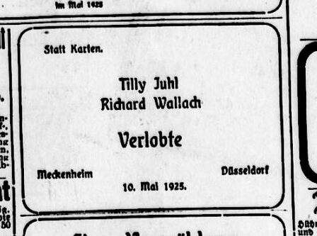 Im Mai 1925 verlobte sich Richard Wallach mit Mathilde Juhl aus Meckenheim. Sie war am 15. August 1901 in Meckenheim als Tochter von Benedikt und Lina Juhl, geborene Hirsch, zur Welt gekommen. Sie hatte noch zwei jüngere Brüder: Fritz (geboren 1903) und Erwin (geboren 1905). Zum Zeitpunkt der Verlobung wohnte Richard Wallach in Düsseldorf in der Haroldstraße 1. Kurze Zeit später zog er um in die Schwerinstraße 86. Die Hochzeit feierten Richard Wallach und seine Frau Mathilde Juhl am 7. Oktober 1925 in Köln in der Rheinlandloge. Am 8. Mai 1928 wurde ihre einzige Tochter geboren: Ellen.